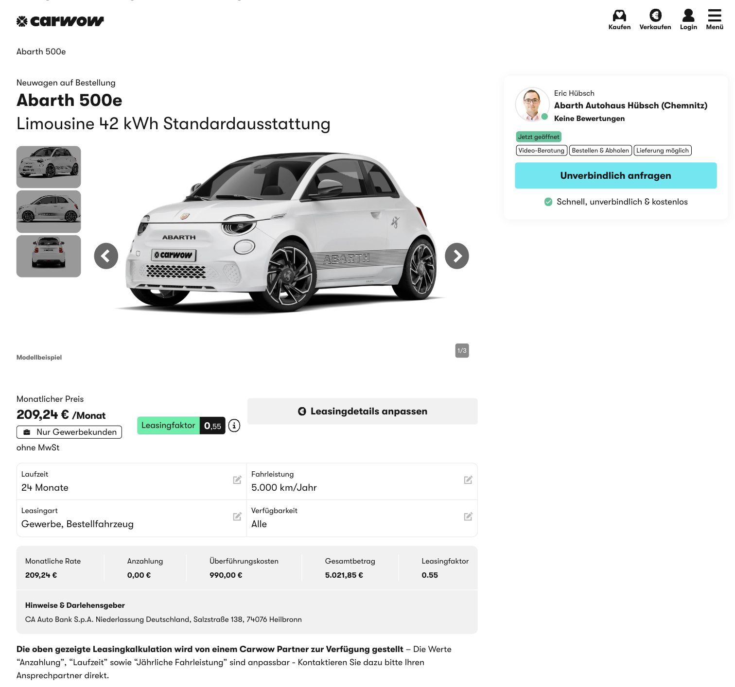 Skorpion im Steckdosen Modus! Dabei kann es sich nur um den Abarth 500e handeln, den Geschäftskunden bei carwow für 209,24 Euro netto im Monat leasen können, frei konfigurierbar von Lack über Felgen bis zu den Extras. Der Abarth 500e ist die sportliche Variante des beliebten Stromers aus Italien.