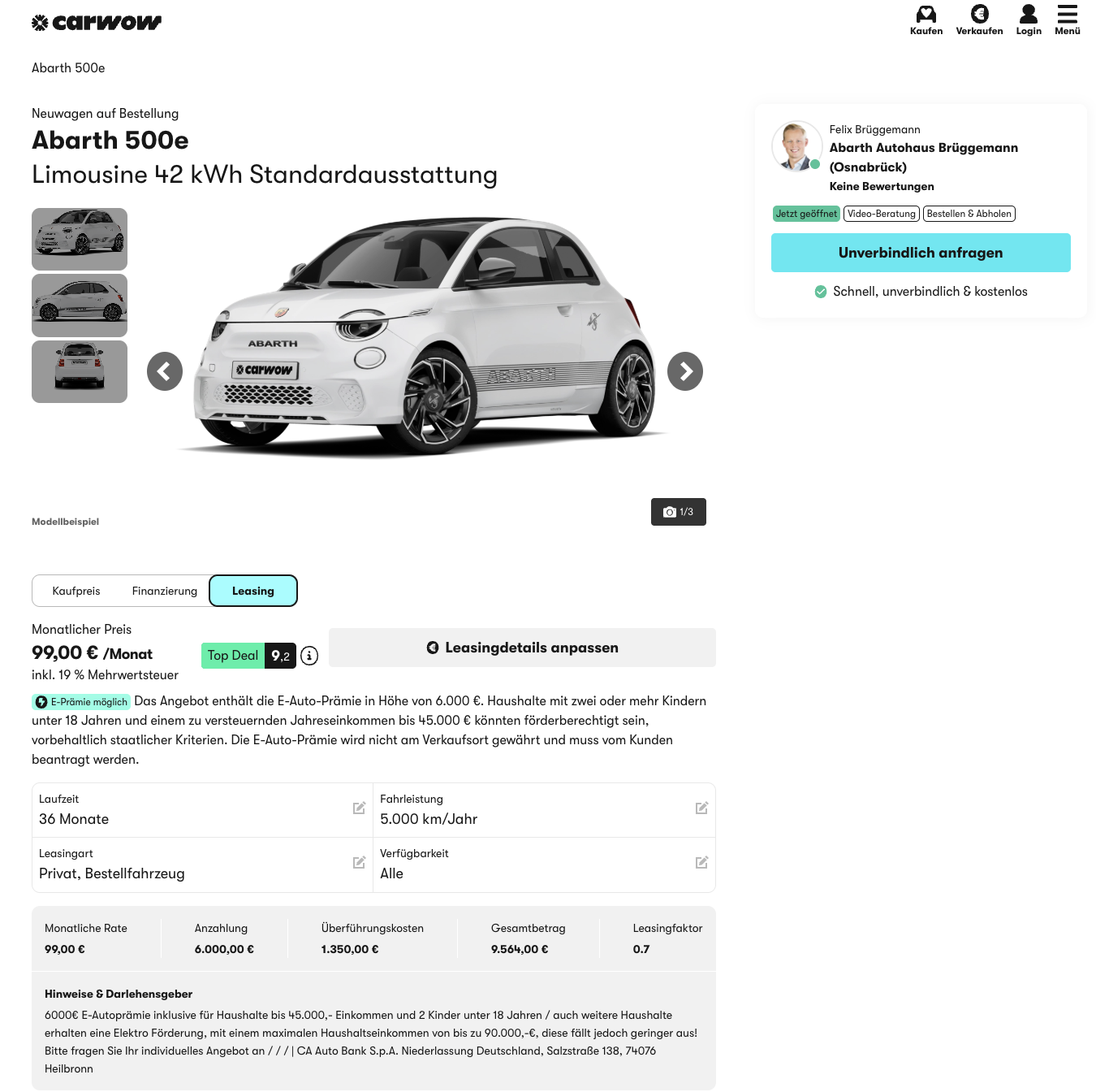 Die Beispielrechnung basiert auf 36 Monaten Laufzeit und 5.000 Kilometern pro Jahr, Anpassungen sind in der Regel möglich.