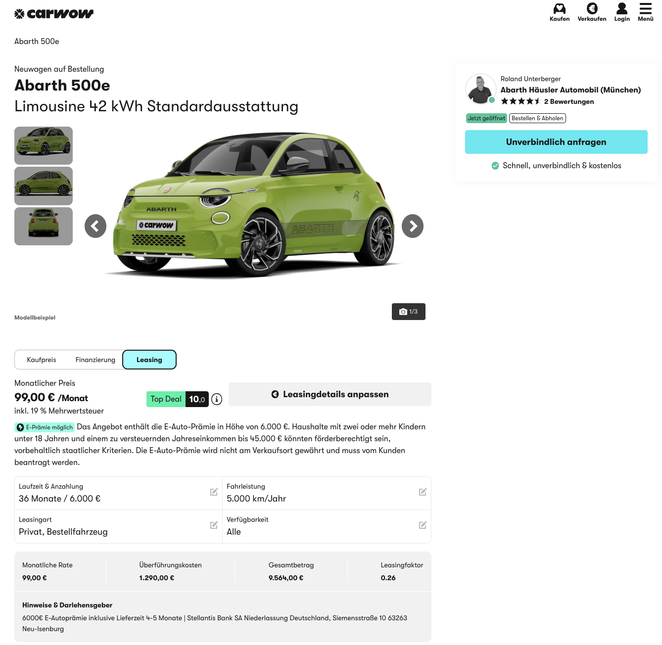 Abarth 500e Leasing für 99 [266] Euro im Monat brutto [Umwelt]