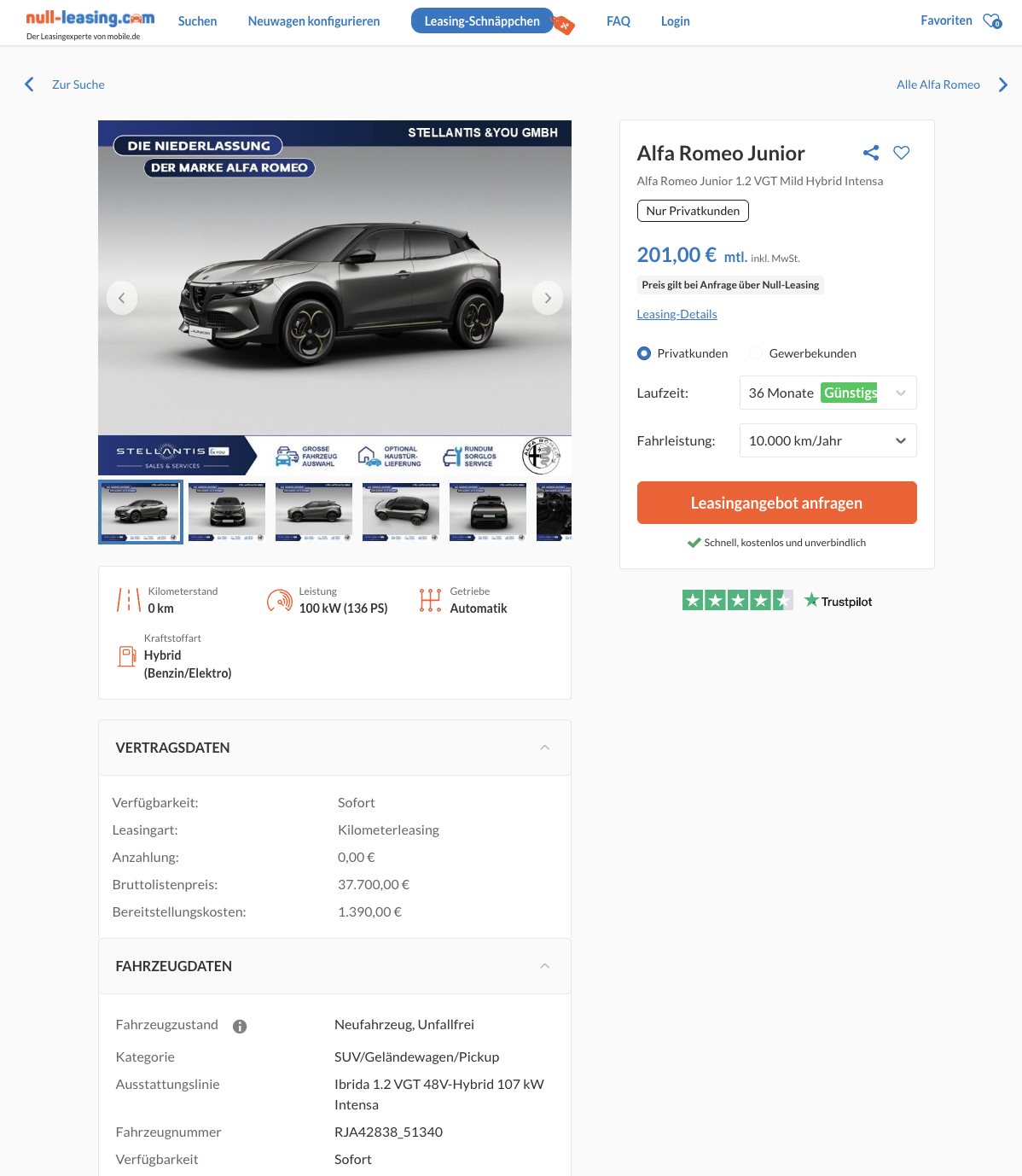 Das Angebot von Null-Leasing ist bewusst geradlinig aufgebaut. Die Kalkulation basiert auf 36 Monaten Laufzeit und 10.000 Kilometern pro Jahr, bei Bedarf lässt sich beides anpassen. Da es sich um einen Lagerwagen handelt, entfällt das Warten auf Produktionsslots, der kompakte Alfa mit Intensa Ausstattungslinie steht in dieser Konfiguration schon bereit. Damit verbindet das Paket italienischen Stil, moderne Mild Hybrid Technik und klare Leasingkonditionen zu einem Einstieg in die Alfa Welt, der optisch und finanziell reizvoll wirkt.