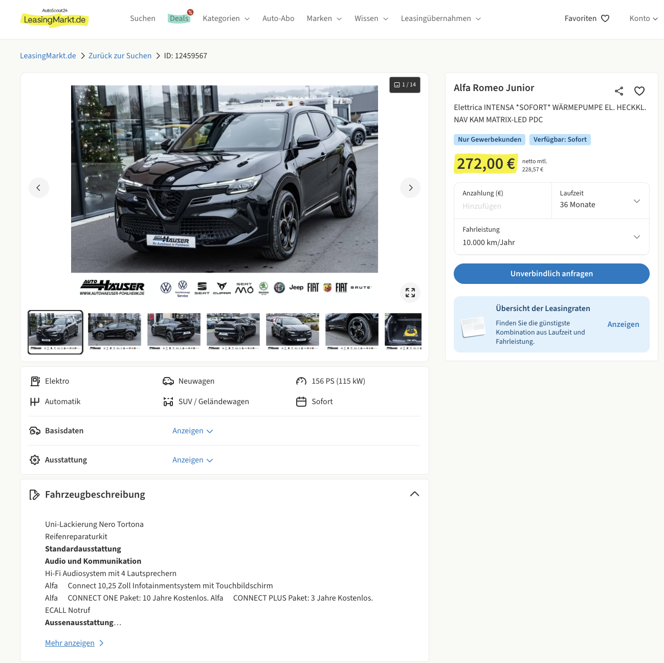 Kalkuliert ist das Angebot mit 36 Monaten Laufzeit und 10.000 Kilometern pro Jahr. Und weil Alfa Romeo beim Platzhirsch aktuell nicht gelistet ist, landet ihr hier bei einem Deal abseits der typischen Standardprogramme, mit sofort verfügbarem Lagerwagen und einer Rate, die für einen Premium geprägten E-SUV ziemlich selbstbewusst wirkt.