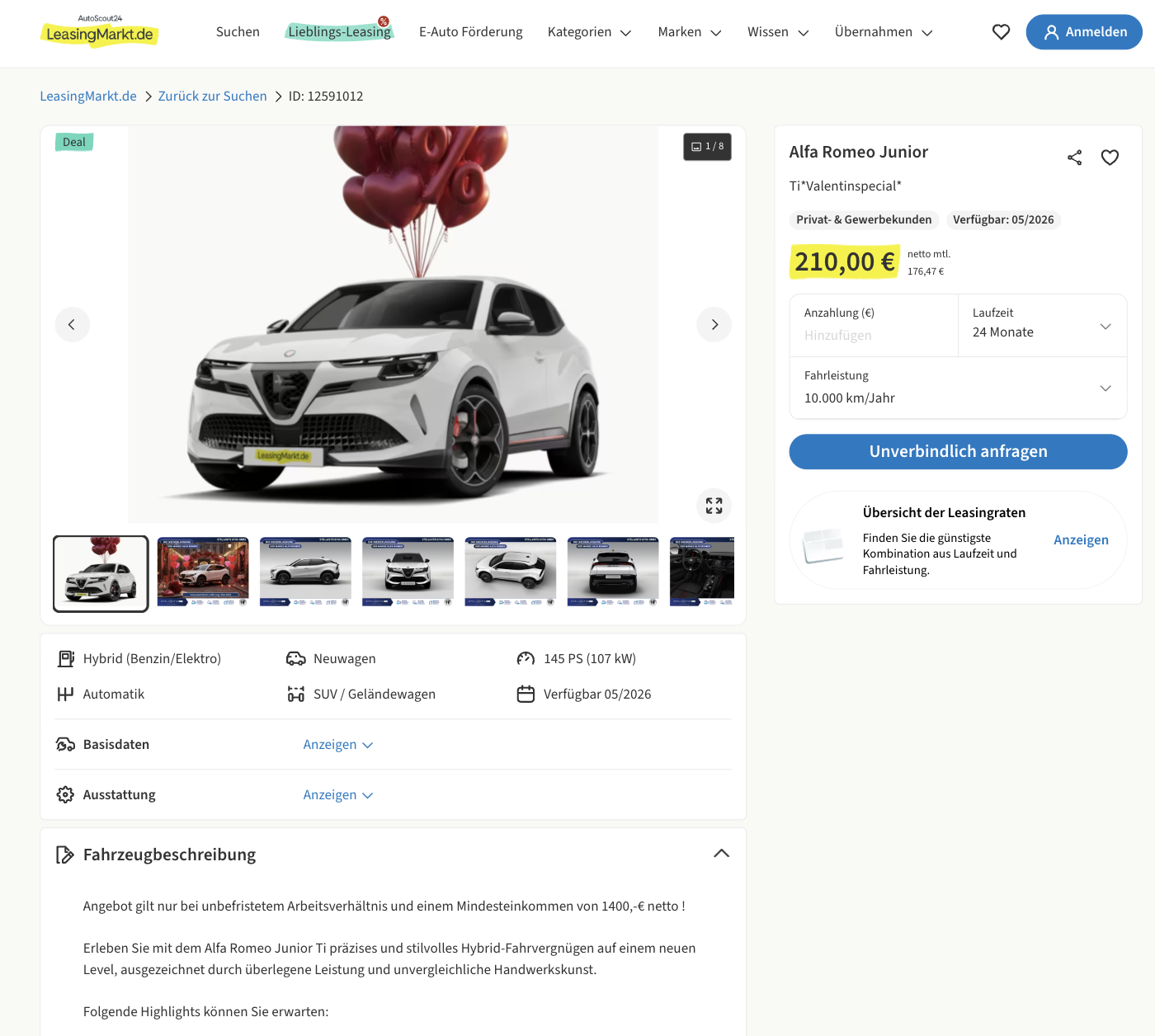 Wer einen Alfa Romeo Junior 1.2 MHEV Ti im Leasing, einen stilvollen Hybrid für den Alltag oder ein kompaktes Fahrzeug mit emotionalem Auftritt sucht, findet hier eine Kombination aus Design, moderner Technik und planbarer Rate. Lieferung ab Mai 2026, klare Ausstattung, klarer Preis, genau diese Mischung macht das Angebot interessant.