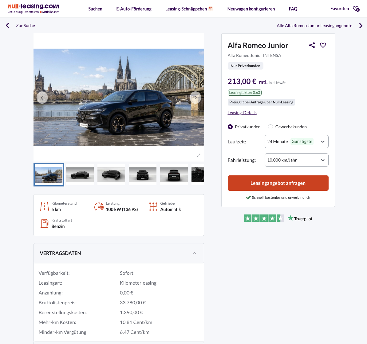 Alfa Romeo Junior Leasing für 213 Euro im Monat brutto [sofort verfügbar]