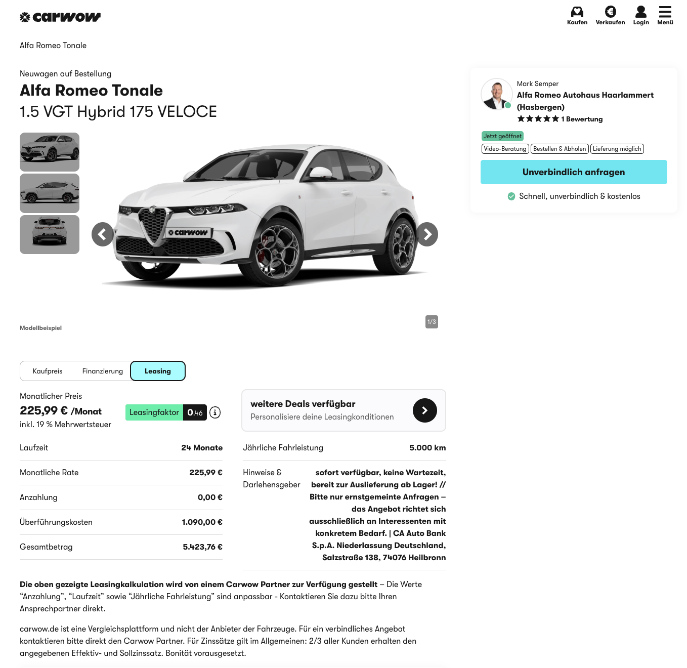 Die Beispielkonditionen liegen bei 24 Monaten Laufzeit und 5.000 Kilometern Fahrleistung pro Jahr, beides lässt sich an euren Bedarf anpassen, wenn der Alltag mehr Strecke verlangt. In Summe steht hier ein Alfa Romeo Tonale VELOCE mit kräftigem Hybridantrieb, sehr guter Serienausstattung und markantem Design, der mit einem attraktiven Monatsbetrag und starkem Leasingfaktor nicht nur Herzen, sondern auch Tabellenkalkulationen überzeugt.