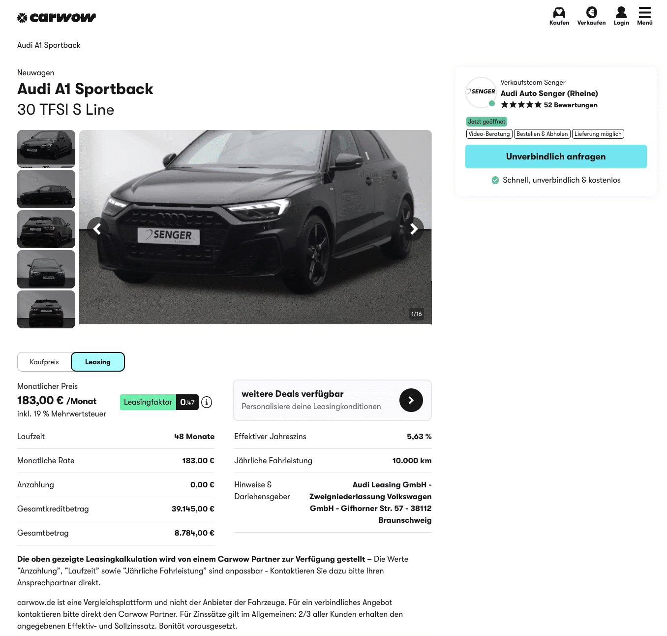 Im Vergleich wird der Vorteil greifbar, denn der Platzhirsch ruft 336 Euro brutto für eine vergleichbare Konfiguration auf. Gegenüber den 183 Euro bei carwow ergibt sich eine deutliche Differenz, Monat für Monat.