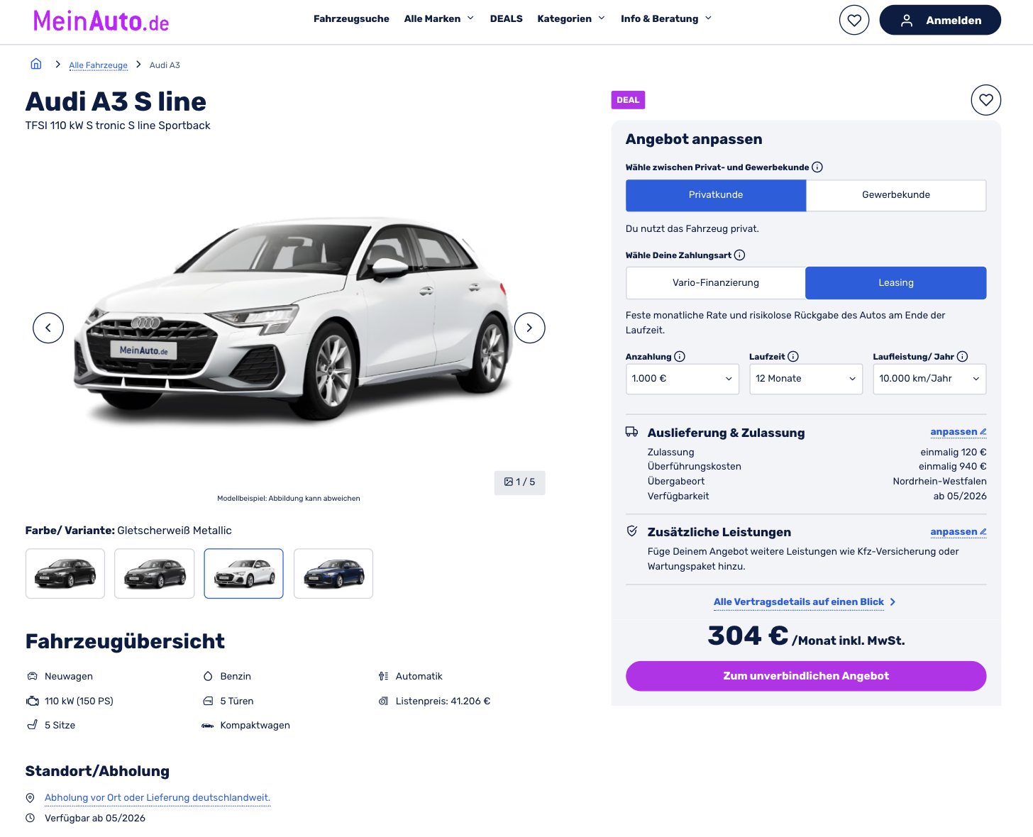Audi A3 Sportback TFSI 110 kW S tronic S line bei MeinAuto im 12-Moants-Leasing fĂŒr 304 Euro im Monat brutto leasen, mit einer Sonderzahlung von 1.000 Euro und einem Leasingfaktor von 0,94. Der Audi ist bereits vorkonfiguriert und kommt mit einer Sonderausstattung im Wert von 3.456 Euro. Zur Wahl stehen die Metallic-Lackierungen Mythosschwarz, GletscherweiĂ und Navarrablau sowie Daytonagrau Perleffekt. VerfĂŒgbar ab Mai 2026.