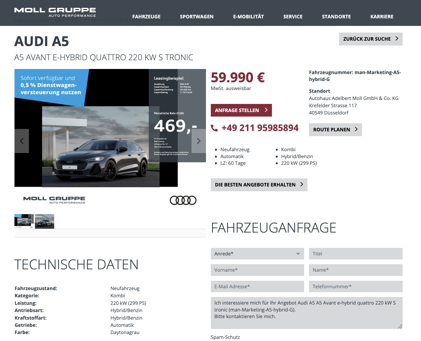 Die Beispielkalkulation läuft über 36 Monate und 10.000 Kilometer pro Jahr, Anpassungen sind möglich, wenn Laufzeit oder Fahrleistung anders ausfallen sollen. Besonders stark wird das Angebot im Vergleich. Während der Platzhirsch aktuell 638 Euro netto pro Monat aufruft, stehen hier 469 Euro netto. Wer einen sofort verfügbaren Premium-Plug-in-Hybrid sucht, der Leistung, Effizienz und Raumangebot verbindet und dabei wirtschaftlich bleibt, findet im Audi A5 Avant e-hybrid eines der derzeit überzeugendsten Angebote im Segment.