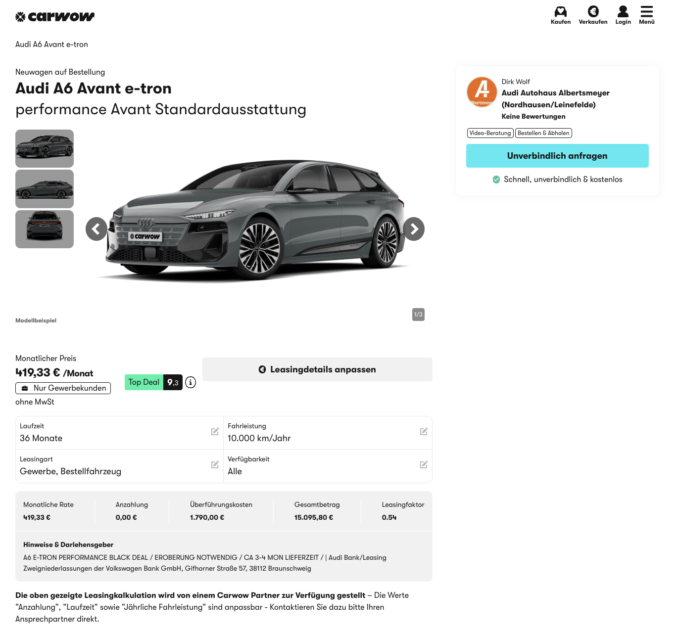 Progressiver Kombi, der Effizienz und Premium-Feeling sauber zusammenbringt. Angeboten wird der Audi A6 Avant e-tron performance bei carwow für 419,33 Euro im Monat netto, ein Angebot für Geschäftskunden, allerdings nur für eroberte Kunden, ein Fremdfabrikat-Nachweis ist notwendig. Gelistet ist der Deal als Bestellaktion, ihr könnt den Wagen also individuell konfigurieren, die Lieferzeit liegt bei drei bis vier Monaten. Und ja, der Blick auf den Markt passt, denn während für den Audi e-tron beim Platzhirsch derzeit 747 Euro netto monatlich aufgerufen werden, wirkt dieses Angebot im direkten Vergleich spürbar näher an der Realität vieler Fuhrparks.