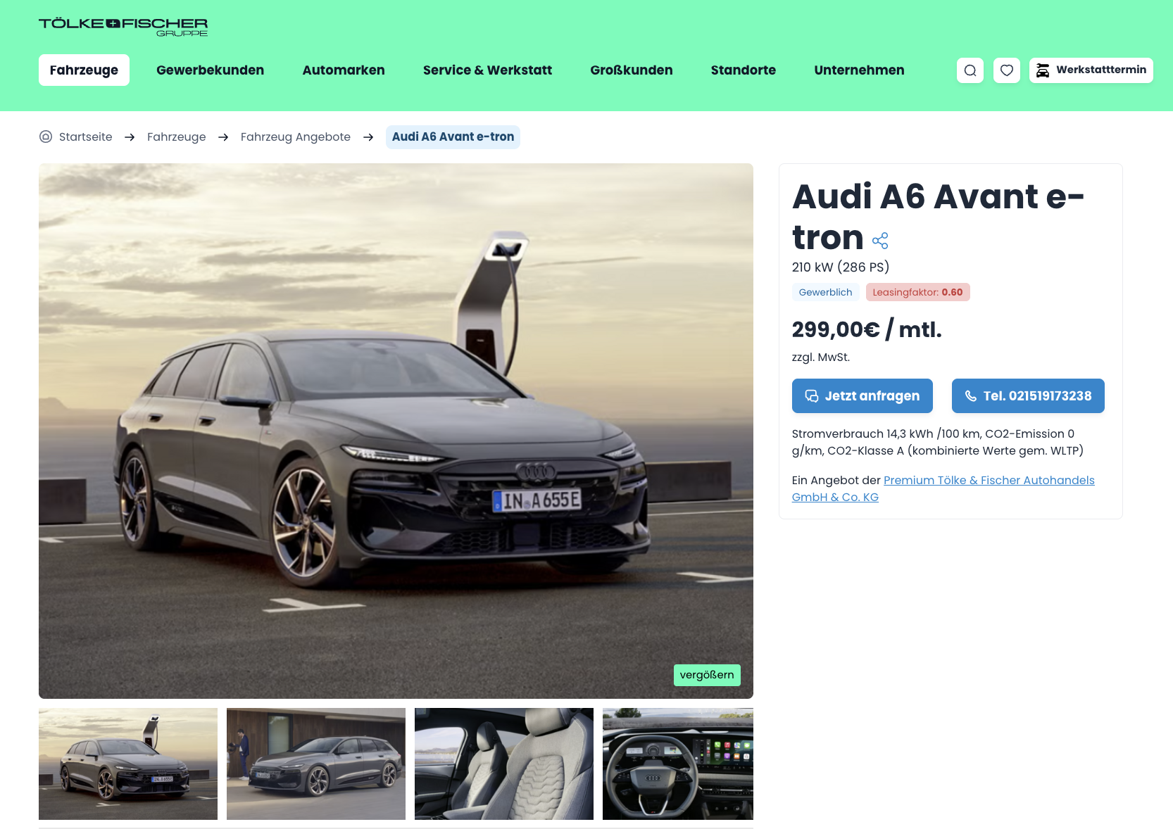 Ein Kombi für lange Strecken, leises Gleiten und moderne Technik, genau dafür steht der Audi A6 e-tron Avant. Geschäftskunden können den Audi A6 e-tron Avant jetzt bei Tölke+Fischer für 299 Euro netto im Monat sichern. Die Kalkulation basiert auf 990 Euro Anzahlung, wodurch sich eine effektive Rate von 326,50 Euro netto ergibt. Bestellt wird frei nach Wunsch, von der Farbe bis zur Ausstattung.