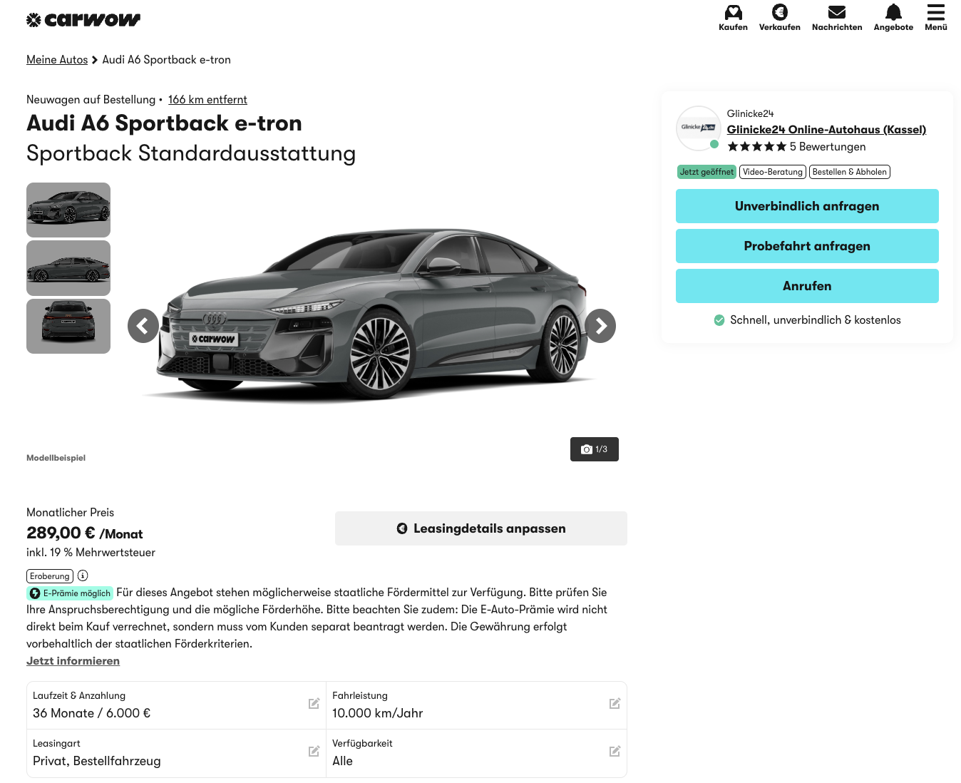 Der Audi A6 Sportback e-tron steht für moderne Businessklasse ohne Verbrenner, dafür mit viel Reichweite und klarer Effizienz. Audi A6 Sportback e-tron bei carwow für 289 Euro brutto im Monat bringt genau dieses Konzept aktuell zu einer auffällig niedrigen Rate ins Privatleasing. Kalkuliert wurde das Angebot mit 6.000 Euro Anzahlung, die der möglichen Umweltprämie entspricht. Umgerechnet auf die Laufzeit ergibt sich eine realistische Leasingrate von 455,67 Euro brutto im Monat. Wer mehr Ausstattung möchte, bekommt den performance Sportback S line business für 379 Euro brutto monatlich, ebenfalls bei identischer Sonderzahlung. Das Fahrzeug ist frei konfigurierbar und wird nach Bestellung in rund drei Monaten ausgeliefert.