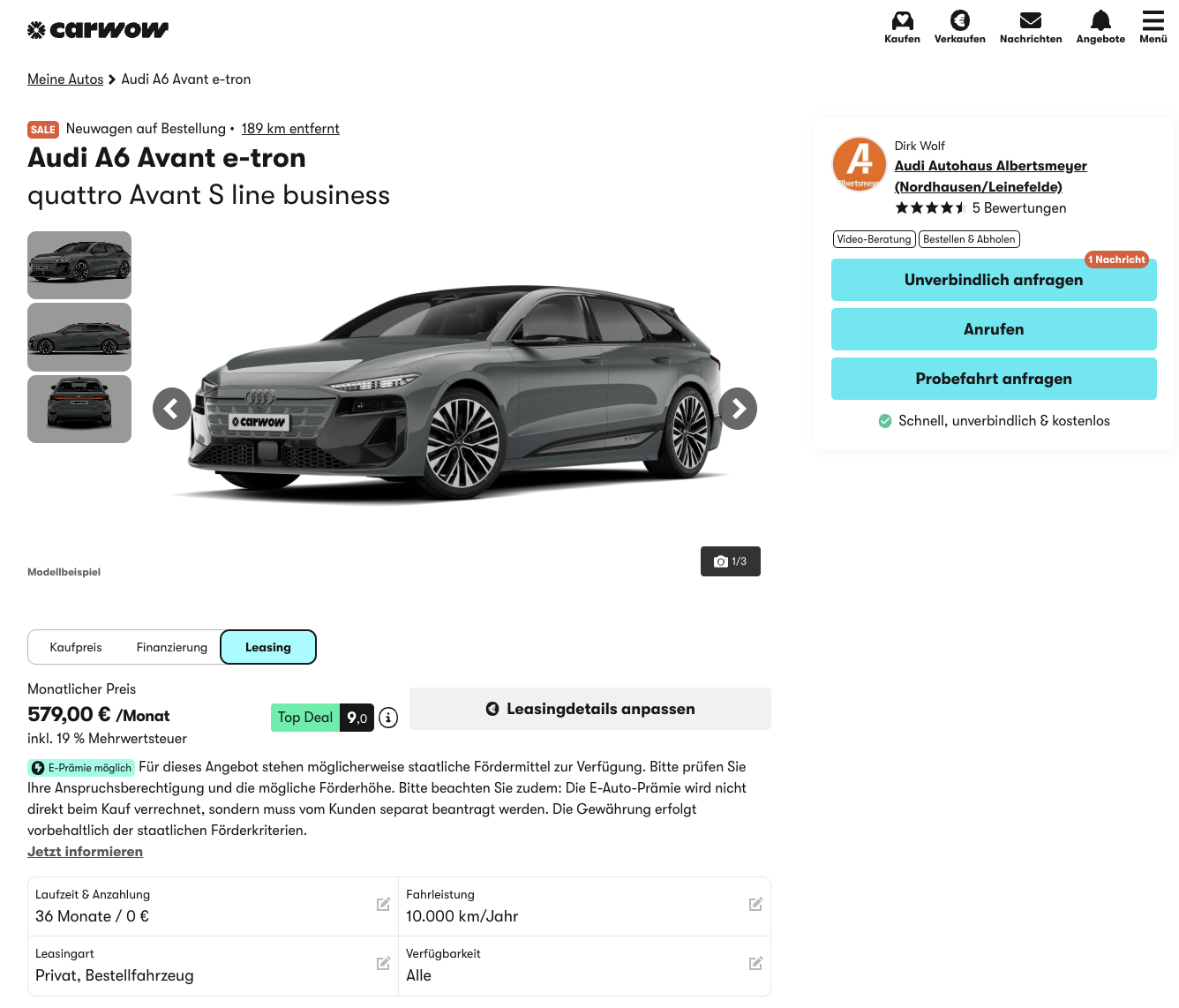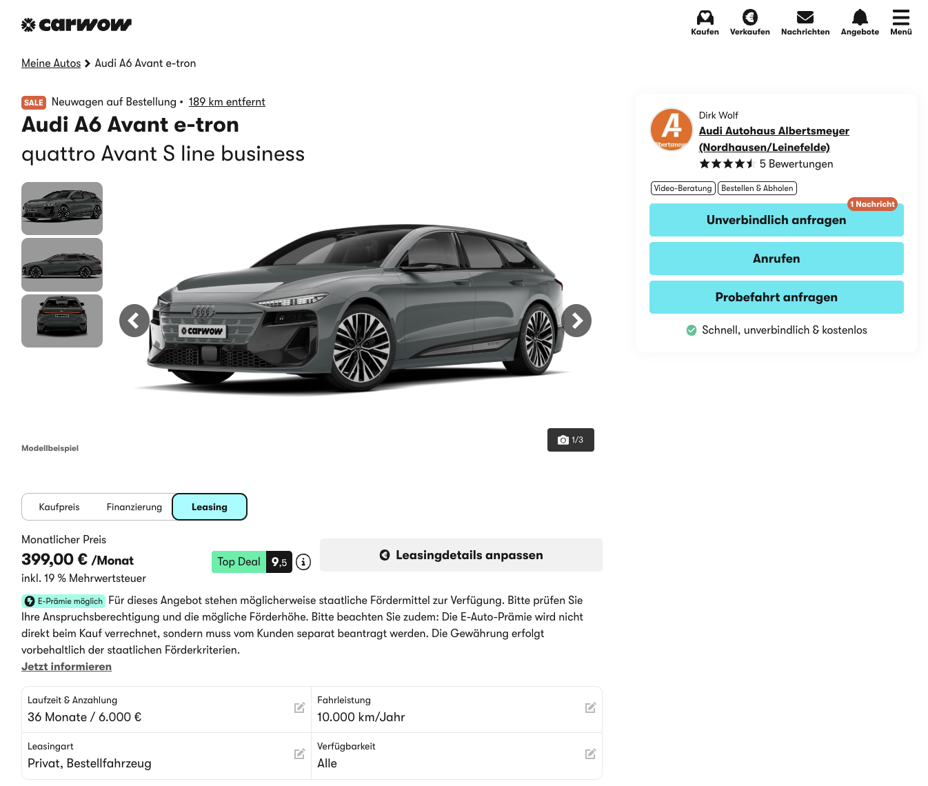 Der Audi A6 Avant e-tron bringt die klassische Kombiform in die neue Elektro-Ära und verbindet Reichweite, Leistung und Premium-Ausstattung auf hohem Niveau. Audi A6 Avant e-tron quattro S line bei carwow für 399 Euro brutto im Monat setzt auf eine Kalkulation mit 6.000 Euro Umweltprämie. Alternativ liegt die Rate bei 579 Euro brutto ohne Vorauszahlung. Es handelt sich um ein Vorlauffahrzeug mit rund 8 Wochen Lieferzeit, verfügbar in Daytona Grau Perleffekt.