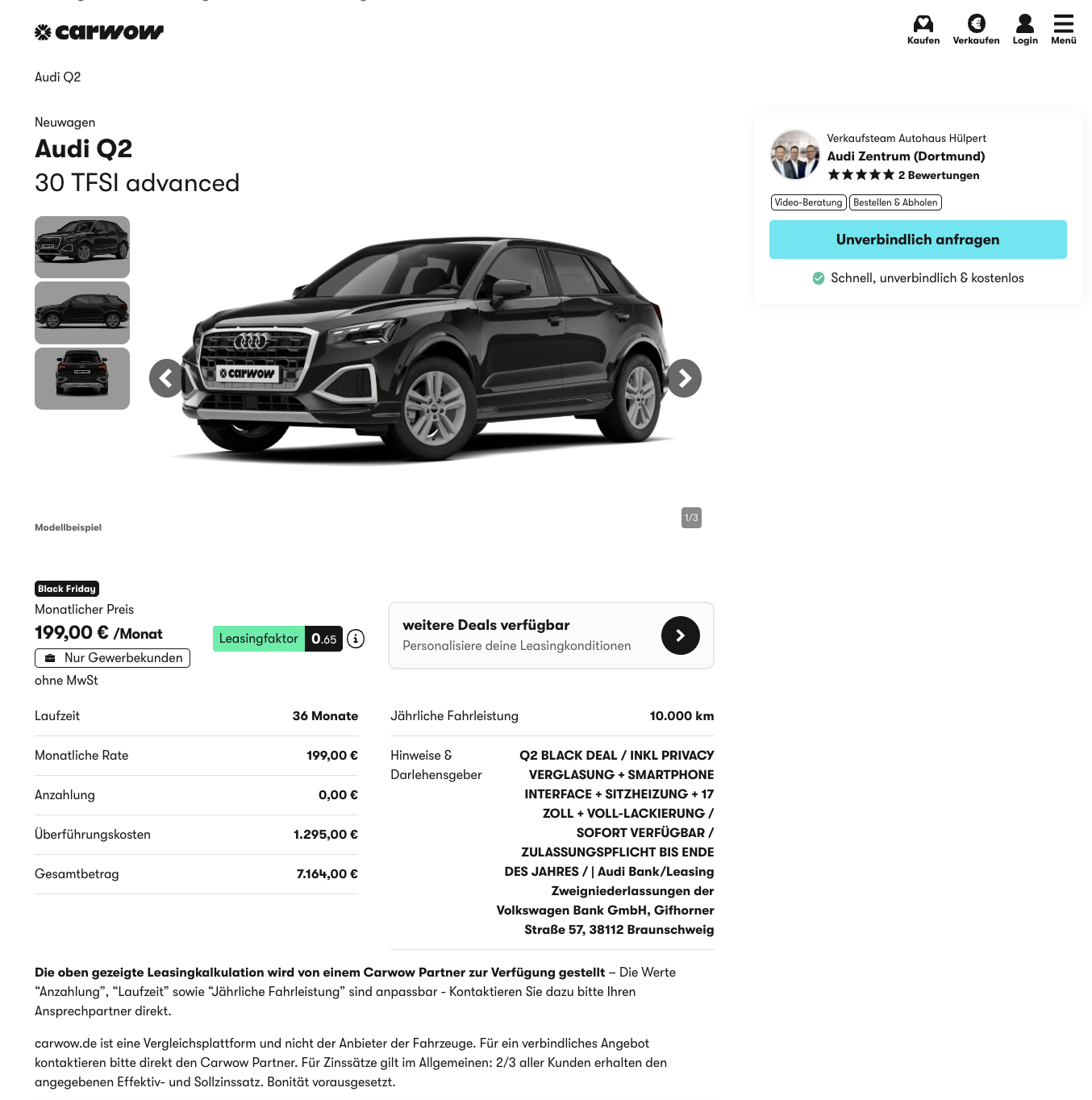 Das Angebot bei carwow ist auf 36 Monate Laufzeit und 10.000 Kilometer im Jahr ausgelegt, die Parameter lassen sich bei Bedarf an euer Profil anpassen. Im direkten Vergleich mit dem Platzhirsch zeigt sich der Hebel sehr deutlich, dort stehen 304 Euro netto im Monat, hier sind es 199 Euro netto. Die Differenz von etwa 105 Euro pro Monat, über drei Jahre also rund 3.780 Euro.