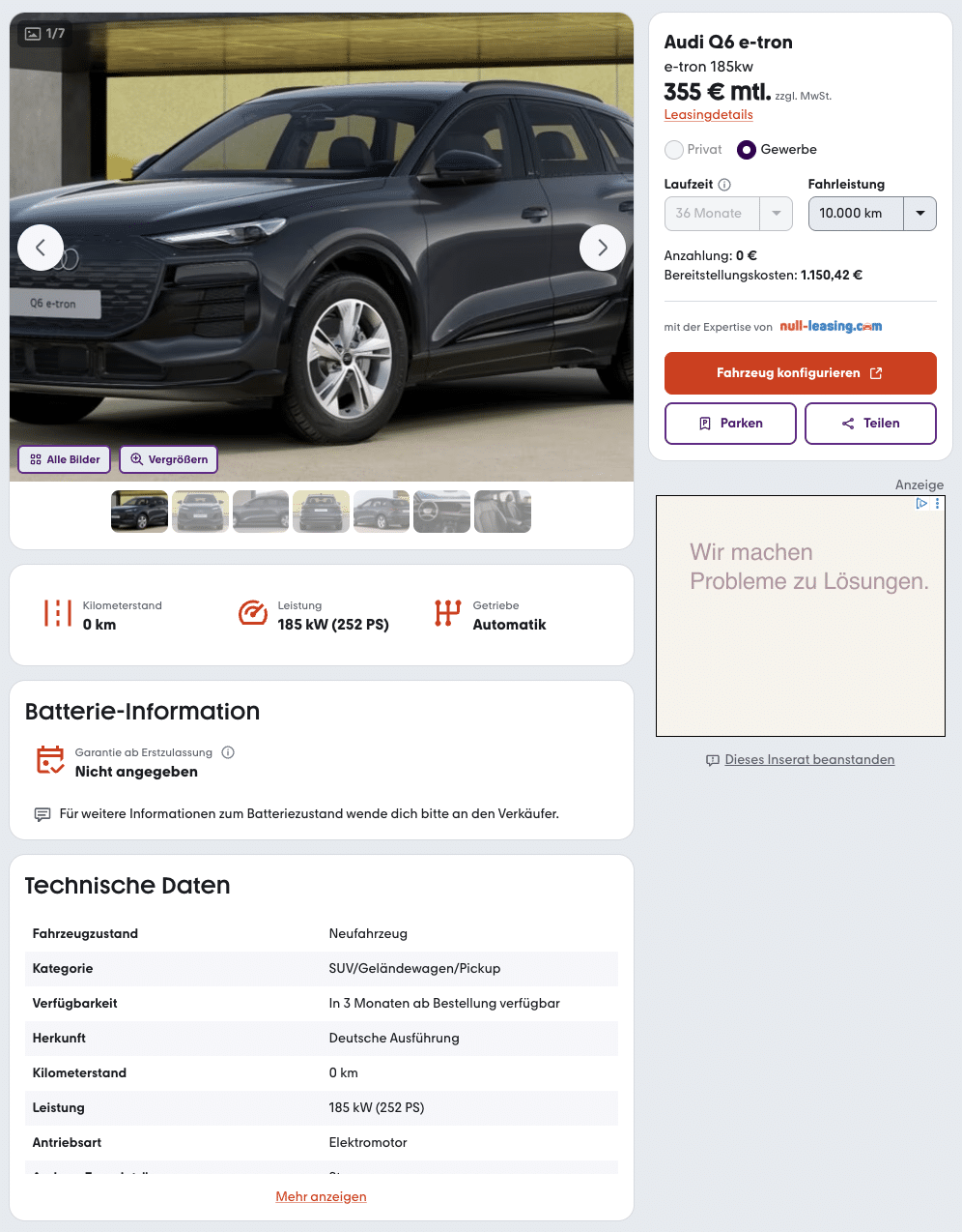 Ein neuer Meilenstein aus Ingolstadt! Der Audi Q6 e-tron markiert den Beginn einer neuen Elektro-Ära bei Audi, technologisch, optisch und fahrdynamisch. Bei mobile.de gibt es das vollelektrische SUV aktuell im Geschäftsleasing für 355 Euro netto im Monat. Es handelt sich um ein frei konfigurierbares Bestellfahrzeug mit einer Lieferzeit von rund drei Monaten.