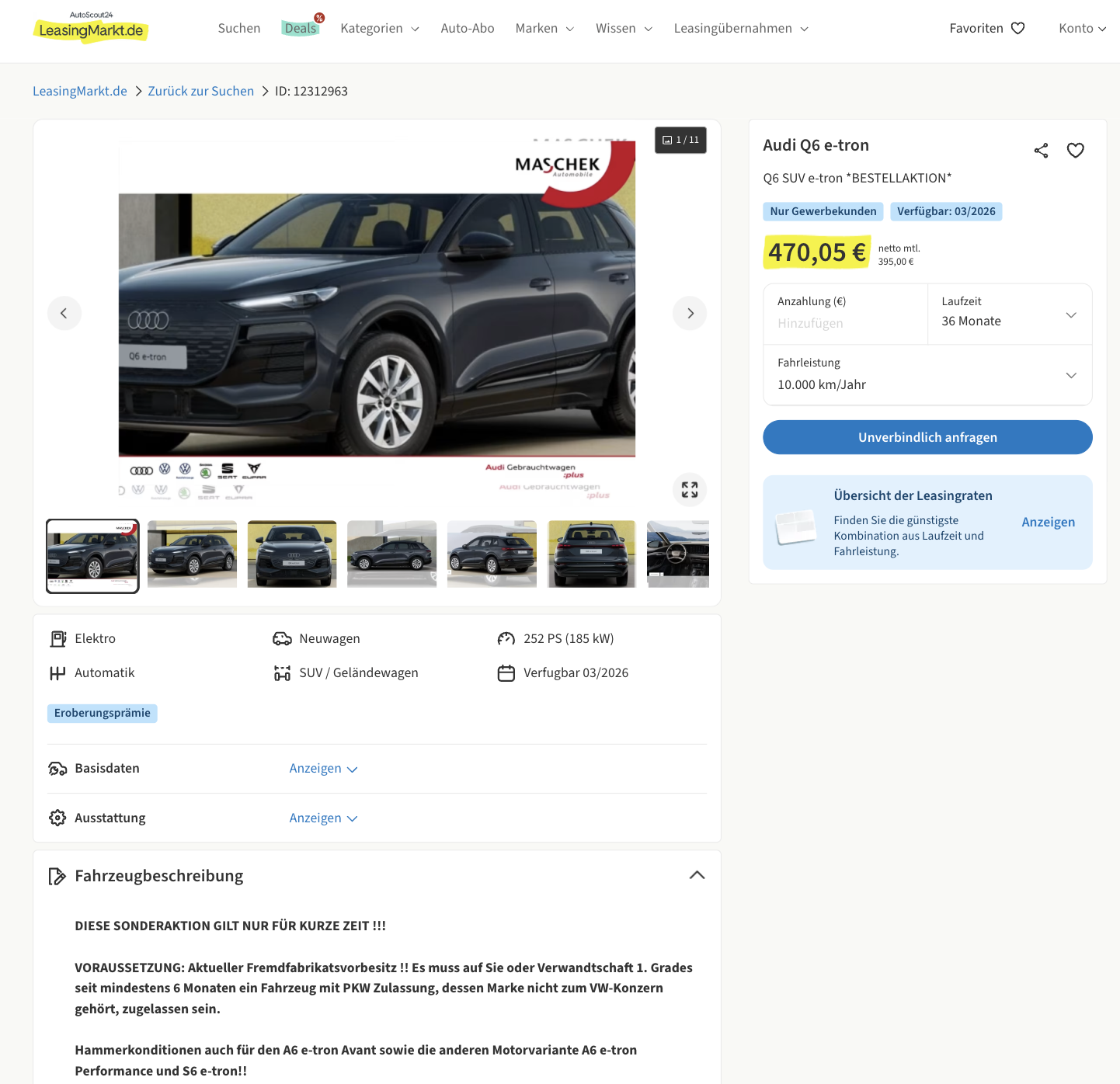 Ein E-SUV, das Ladetempo und Premiumgefühl auf ein neues Level hebt. Den Audi Q6 e tron gibt es aktuell bei LeasingMarkt für 395 Euro brutto im Monat im Geschäftsleasing, als Eroberungsangebot für alle, die aktuell keinen Audi fahren, dafür braucht ihr den Nachweis eines Fremdfabrikats. Weil es ein frei konfigurierbares Bestellfahrzeug ist, entsteht der Q6 so, wie er zu eurem Fuhrpark passt, die Lieferzeit liegt bei rund drei Monaten.