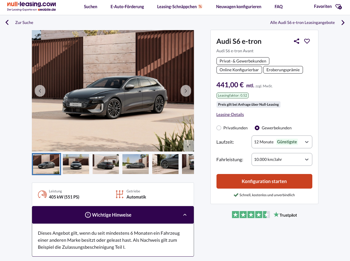 Mehr Leistung, mehr Präsenz, mehr Dynamik, genau dafür steht dieser Audi. Sichert euch den Audi S6 e-tron Avant 405 kW bei Null-Leasing für 441 Euro netto im Monat im Kurzzeitleasing für Geschäftskunden. Der Leasingfaktor liegt bei 0,52, was eine Ansage ist! Die Rate beinhaltet bereits die Eroberungsprämie, die an eine Voraussetzung geknüpft ist. Im Haushalt (Ehepartner, Eltern oder Kinder) oder Unternehmen (Geschäftsführer) muss ein Fahrzeug außerhalb des VW-Konzerns (Audi, Seat, Cupra, Škoda, VW, VW Nutzfahrzeuge, Porsche) vorhanden sein und mindestens 6 Monate auf die Person zugelassen sein. Für Privatkunden liegt der Einstieg bei 525 Euro brutto monatlich. Kalkuliert ist das Angebot mit 12 Monaten Laufzeit und 10.000 Kilometern pro Jahr, Anpassungen sind möglich.
