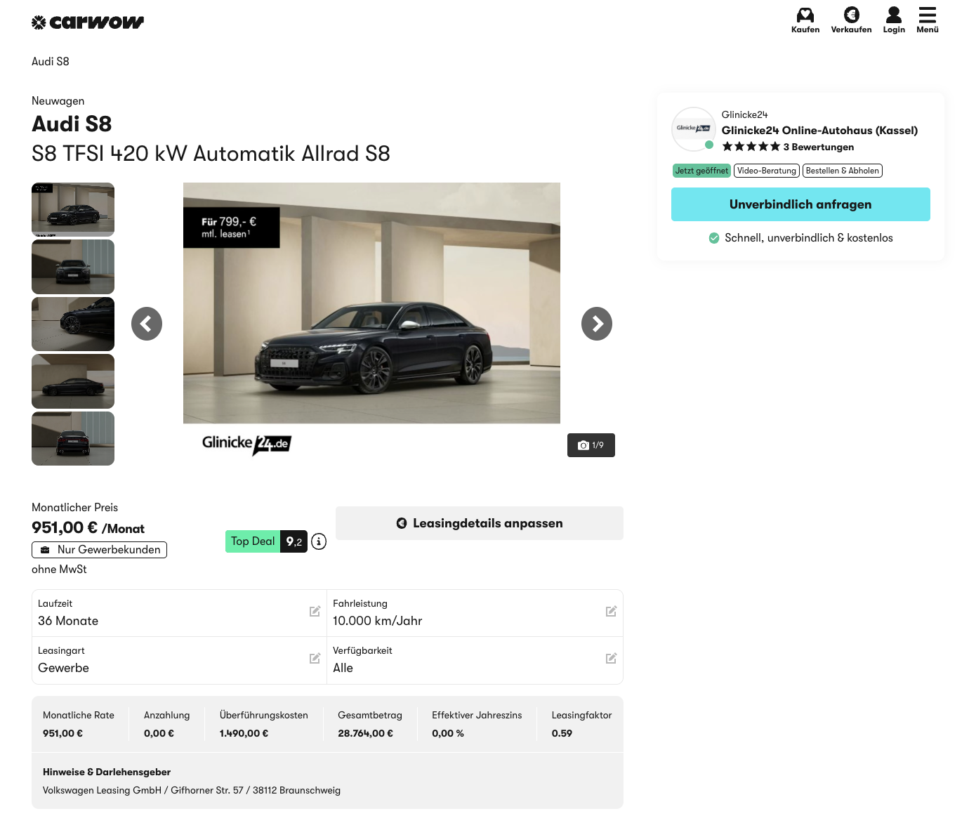Business-Class in Form einer Limousine, der Audi S8. Bei carwow gibt es den Audi S8 TFSI 420 kW quattro tiptronic für 799 Euro netto im Monat im Geschäftsleasing. Der Wagen ist in Sebringschwarz Kristalleffekt lackiert und sofort verfügbarer. Genau diese Kombination macht das Angebot so selten, hohe Leistung, hohe Verfügbarkeit und eine Rate, die im Segment auffällig niedrig wirkt.