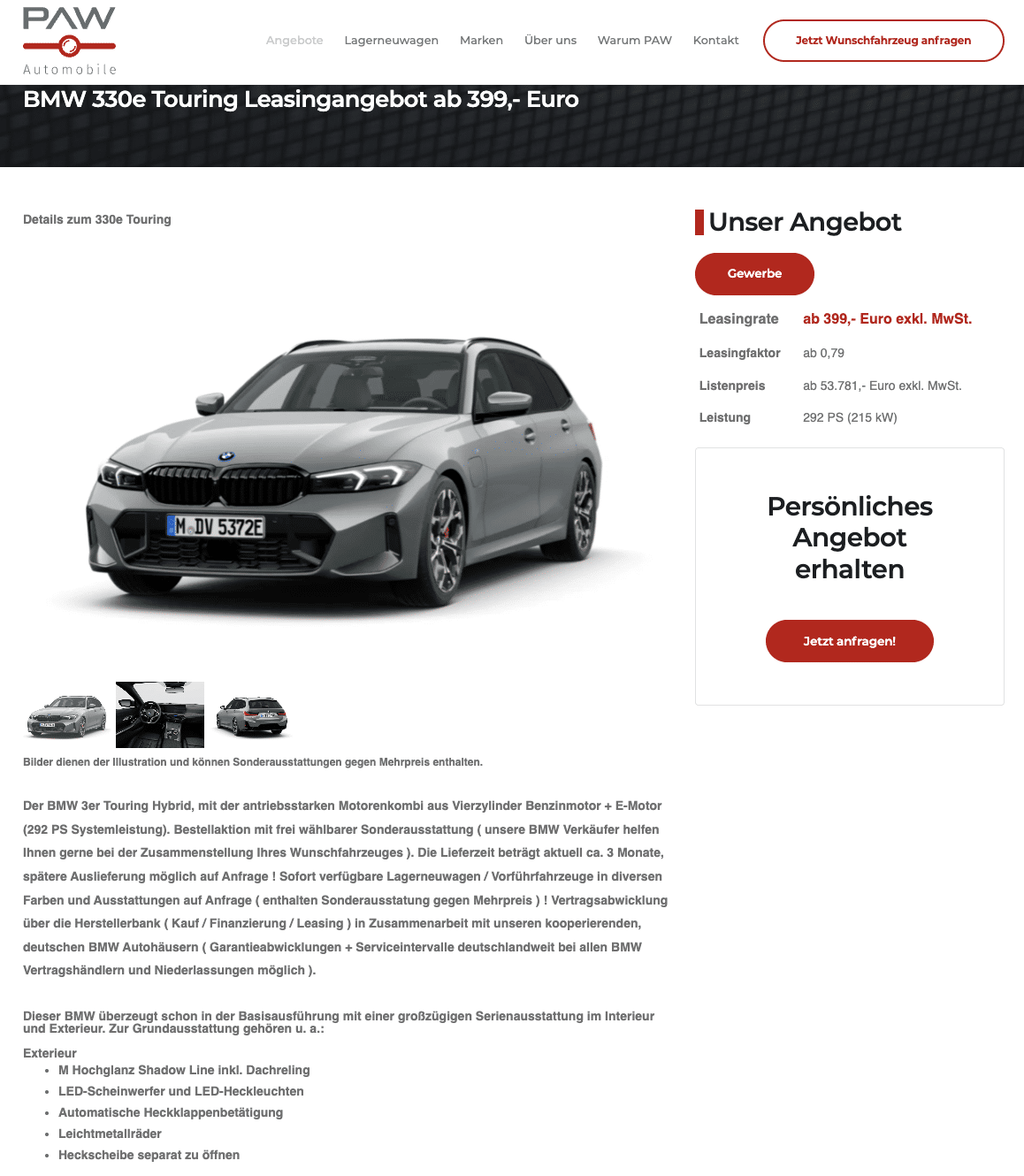 Er ist sportlich, effizient und gleichzeitig ein echtes Raumwunder, der BMW 330e Touring Plug-in-Hybrid. Bei PAW Automobile startet das Geschäftsleasing aktuell schon ab 399 Euro netto im Monat und das für ein frei konfigurierbares Bestellfahrzeug, das in nur drei Monaten geliefert wird. Wer nicht warten will, kann auch auf sofort verfügbare Lager- und Vorführfahrzeuge in verschiedenen Farben und Ausstattungen zurückgreifen.