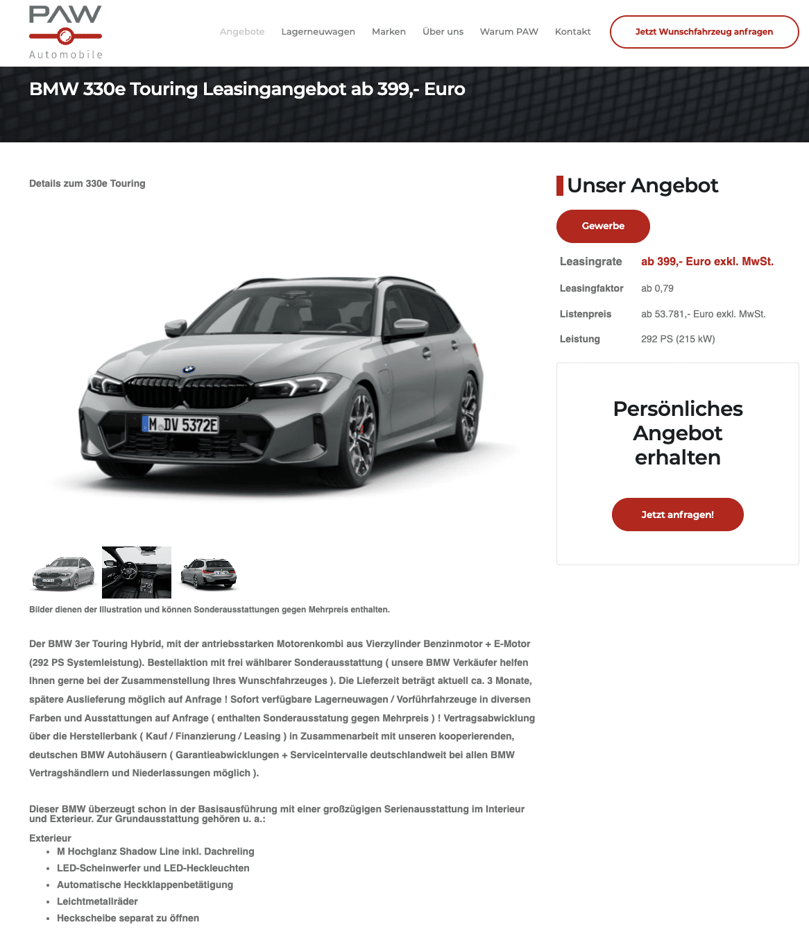 Er ist der Inbegriff des modernen Reisewagens. Der BMW 330e Touring Plug-in-Hybrid vereint Leistung und Nachhaltigkeit wie kaum ein anderes Modell in seiner Klasse. Bei PAW Automobile gibt es den bayrischen Kombi jetzt schon ab 399 Euro netto im Monat im Geschäftsleasing, als frei konfigurierbares Bestellfahrzeug mit einer Lieferzeit von rund drei Monaten. Wer nicht warten möchte, kann sich über sofort verfügbare Lagerfahrzeuge und Vorführer in verschiedenen Farben und Ausstattungen freuen. Auf Wunsch ist auch eine spätere Auslieferung möglich.