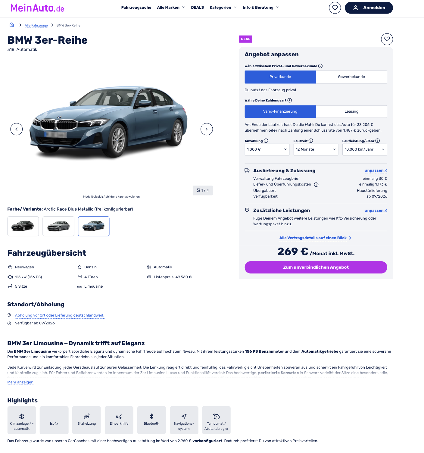 Ein Jahr lang BMW fahren, ohne sich ewig zu binden, genau darauf zielt dieses Angebot ab. Angeboten wird der BMW 3er 318i Automatik bei MeinAuto für 269 Euro brutto im Monat im Vario-Leasing. Die Kondition umfasst 12 Monate Laufzeit, 10.000 Freikilometer und 1.000 Euro Anzahlung, am Ende entscheidet ihr selbst, ob der Dreier bleibt oder geht. Entweder ihr übernehmt die Limousine für 33.206 Euro oder gebt sie nach Zahlung einer Schlussrate von 1.487 Euro zurück. Basis ist eine Bestellaktion, der 3er wird also nach euren Wünschen konfiguriert, vom Lack über Felgen bis zu den Paketen. Wer klassisch leasen möchte, steigt mit 399 Euro brutto im Monat, ebenfalls bei 1.000 Euro Anzahlung und 12 Monaten, ein.