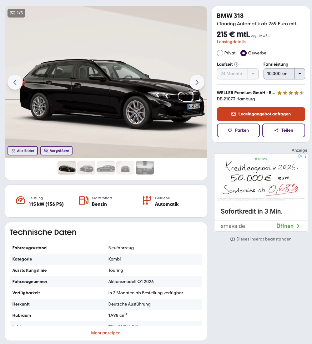 Mit einem Leasingfaktor von 0,53 startet der BMW 318i Touring Automatik bei mobile.de als Geschäftskunden-Deal für 215 Euro netto pro Monat, Privatkunden fahren den bayerischen Kombi für 278 Euro brutto. Angeboten wird ein frei konfigurierbares Bestellfahrzeug mit einer Lieferzeit von rund drei Monaten.