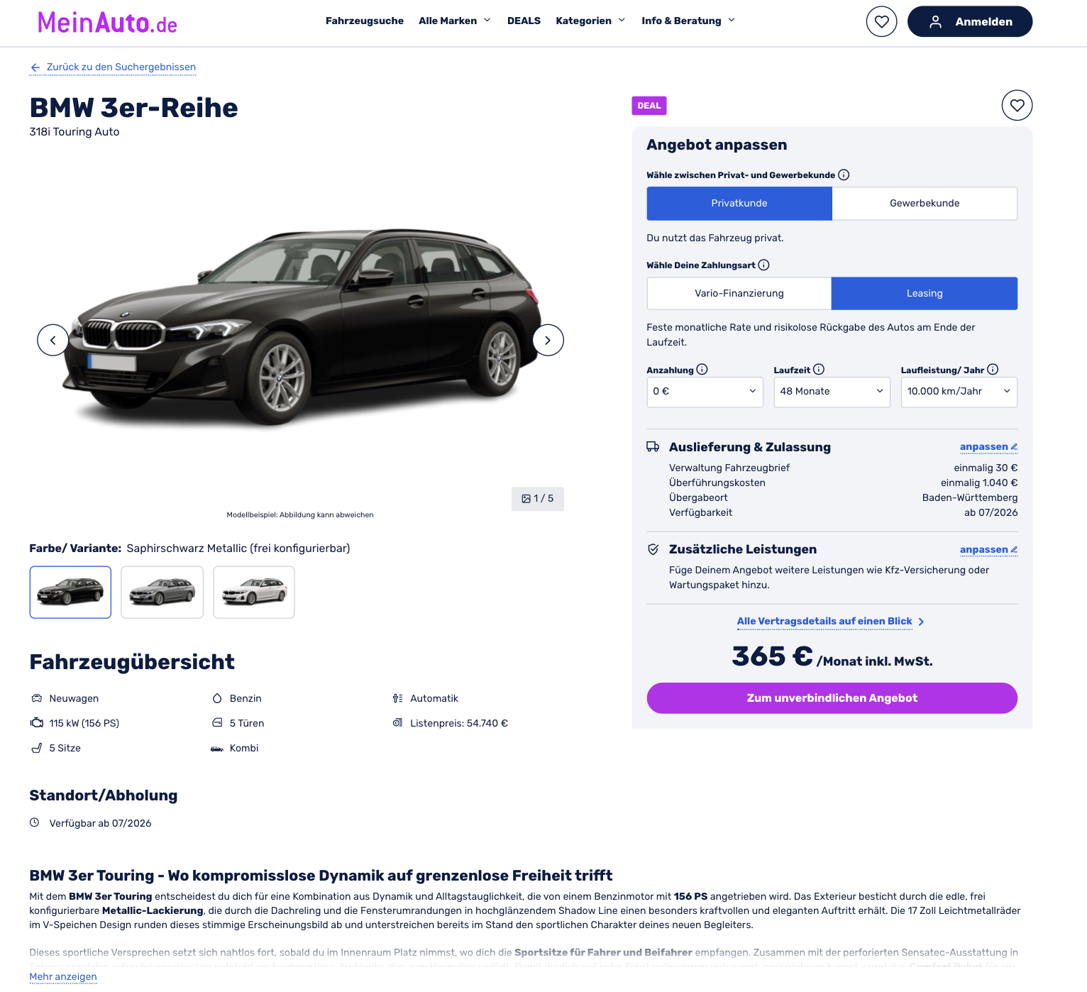 Der Dreier ist der Inbegriff des klassischen BMW-Kombis. Klar gezeichnet, ausgewogen motorisiert und genau auf den Alltag zugeschnitten. Den BMW 318i Touring Auto können Privatkunden bei MeinAuto für 365 Euro brutto im Monat leasen. Ein vorkonfiguriertes Bestellfahrzeug, das nachträglich angepasst werden kann. Die Auslieferung ist aktuell für Juli 2026 geplant, damit richtet sich das Angebot an alle, die bewusst vorausplanen und dafür einen attraktiven Preis nutzen möchten.