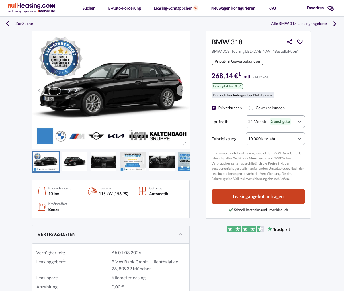 Die Kalkulation basiert auf 24 Monaten Laufzeit und 10.000 Kilometern pro Jahr. Genau hier liegt die Stärke des Angebots. Ein frei konfigurierbarer BMW Kombi mit dieser Technik, diesem Raumangebot und diesem Markenimage ist zu 268,14 Euro brutto im Monat klar auffällig positioniert. Wer einen Premium-Kombi sucht, aber nicht automatisch in deutlich höhere Monatsraten rutschen möchte, findet hier ein Angebot, das im Markt sehr sauber gesetzt ist.