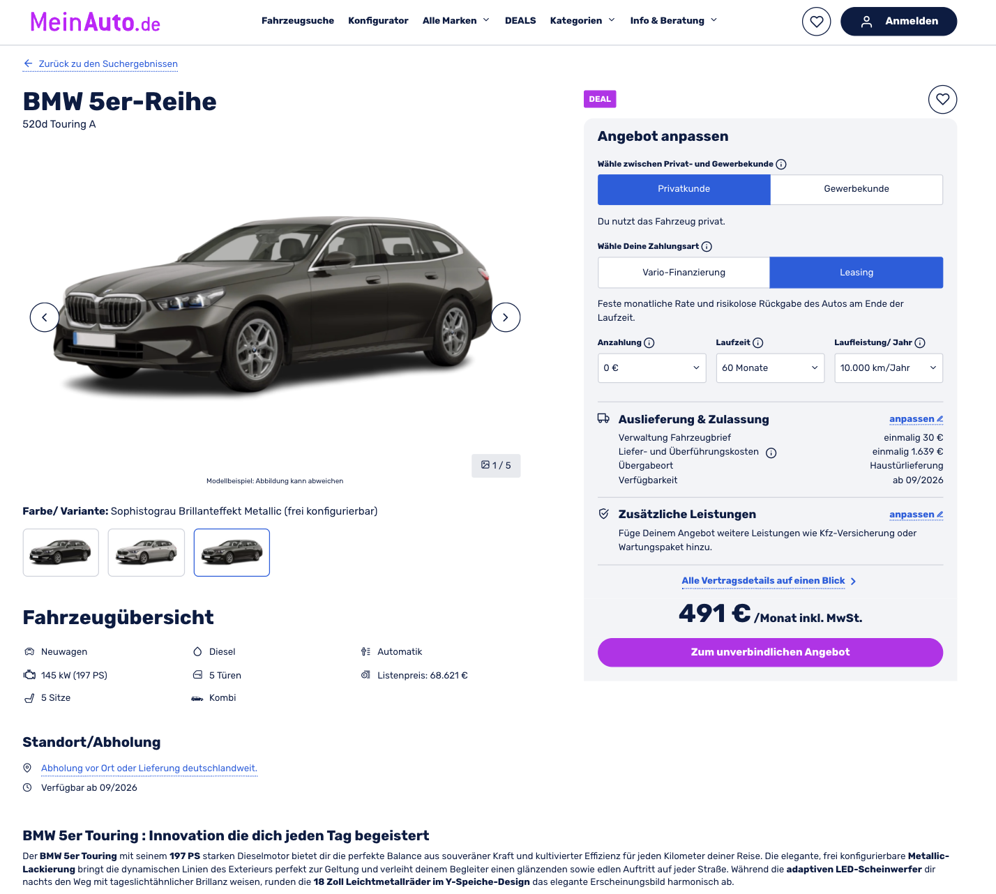 Berechnet wurde das Leasing mit 60 Monaten Laufzeit und 10.000 Kilometern pro Jahr, beide Werte lassen sich anpassen. Mit 491 Euro brutto monatlich liegt dieses Angebot deutlich unter vielen vergleichbaren Offerten. Beim großen Marktführer werden für denselben BMW 5er Touring aktuell rund 556 Euro brutto pro Monat verlangt, wodurch sich ein klarer Preisvorteil ergibt.
