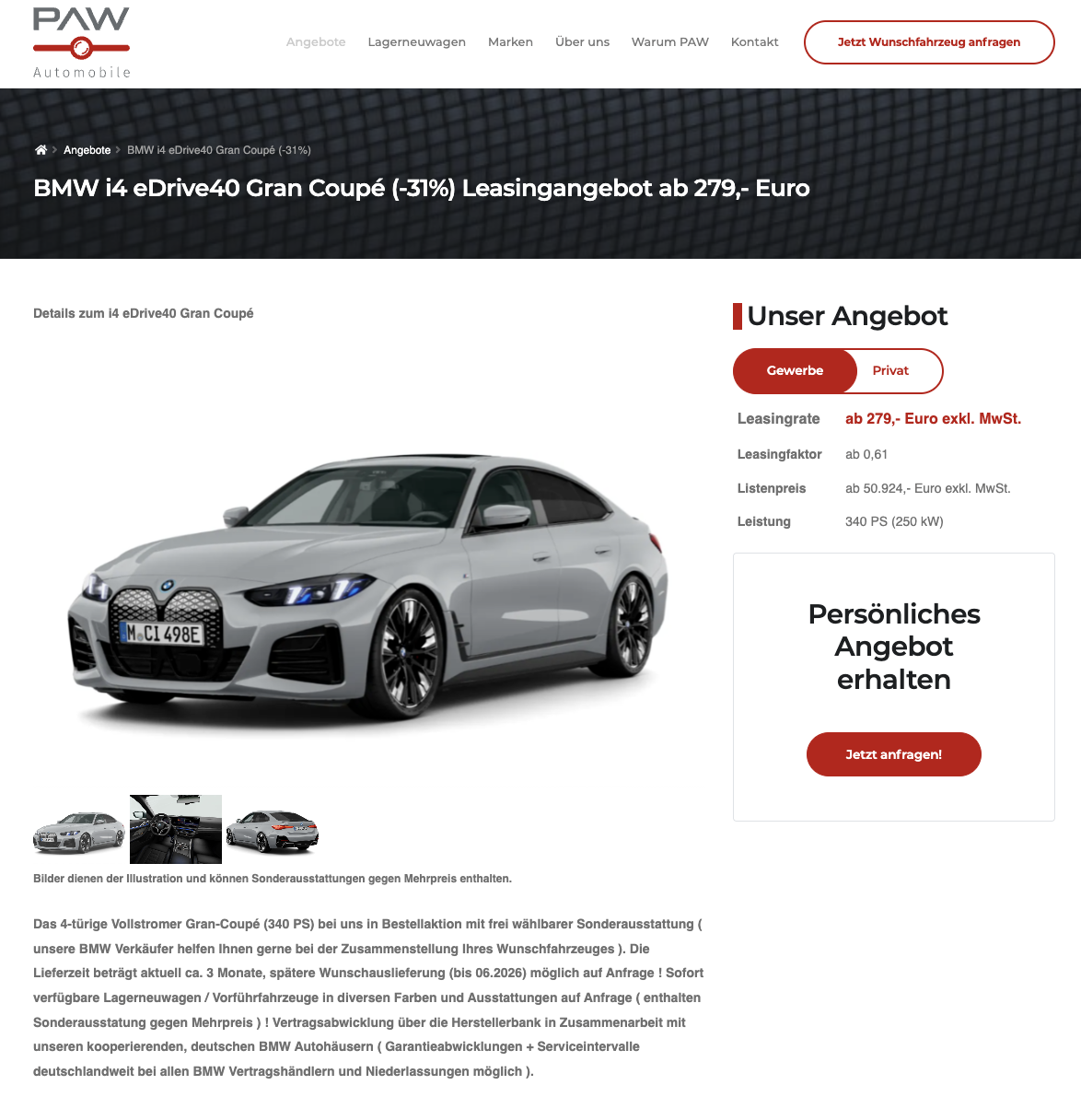 Wer ein sportliches E-Fahrzeug sucht, dann sollte ihr jetzt aufpasse. Bei PAW Automobile gibt es aktuell den BMW i4 eDrive40 Gran Coupé für 279 Euro netto im Monat im Geschäftsleasing, kalkuliert mit 24 Monaten Laufzeit und 5.000 Kilometern pro Jahr. Wer mehr fährt, liegt bei 315 Euro netto im Monat für 10.000 Kilometer, ebenfalls über 24 Monate. Es handelt sich um ein frei konfigurierbares Bestellfahrzeug, die Lieferzeit beträgt rund drei Monate, die Wunschauslieferung ist bis Juni 2026 vorgesehen. Privatkunden steigen ab 395 Euro brutto im Monat ein und holen sich damit ein vollwertiges Elektro Gran Coupé in die Einfahrt.