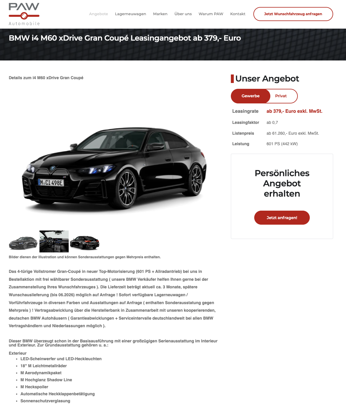 Elektrische M Power im Gran Coupé Kleid, ohne Kompromisse im Alltag oder Komfort. Den BMW i4 M60 xDrive Gran Coupé gibt es bei PAW Automobile für 379 Euro netto im Geschäftsleasing oder für 508 Euro brutto im Monat im Privatleasing. Ein frei konfigurierbares Bestellfahrzeug, das ihr nach euren Vorstellungen zusammenstellen könnt. Die reguläre Lieferzeit liegt bei rund drei Monaten, auf Wunsch plant PAW den Liefertermin sogar bis Juni 2026 ein. Wer nicht warten möchte, kann auf sofort verfügbare Lager und Vorführfahrzeuge in verschiedenen Farben und Ausstattungen zugreifen, ihr kombiniert also Performance, Planbarkeit und Auswahl in einem Paket.