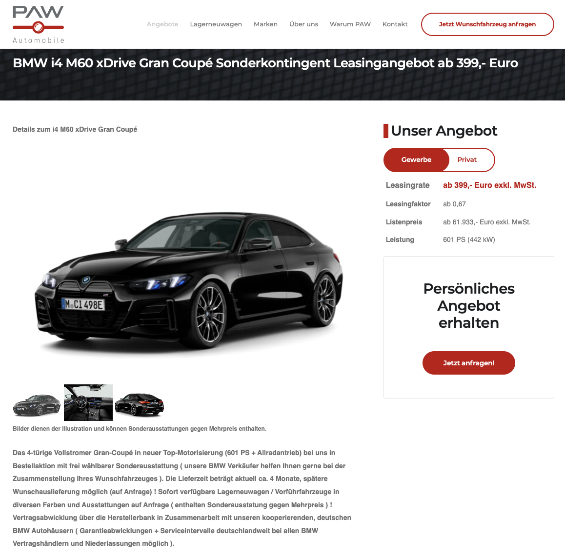 Ein vollelektrischer BMW mit 601 PS! Das gibt es bei PAW Automobile in Form des BMW i4 M60 xDrive Gran Coupé. Geschäftskunden fahren den i4 M60 bereits für 399 Euro netto pro Monat, Privatkunden für 544 Euro brutto pro Monat. Beide Angebote sind auf 36 Monate Laufzeit und 5.000 Kilometer pro Jahr kalkuliert, Anpassungen sind möglich. Angeboten wird ein frei konfigurierbares Bestellfahrzeug mit rund vier Monaten Lieferzeit, auf Wunsch auch mit späterer Wunschauslieferung. Zusätzlich stehen sofort verfügbare Lagerneuwagen und Vorführfahrzeuge in verschiedenen Farben und Ausstattungen auf Anfrage bereit, Sonderausstattung ist je nach Fahrzeug gegen Mehrpreis enthalten.