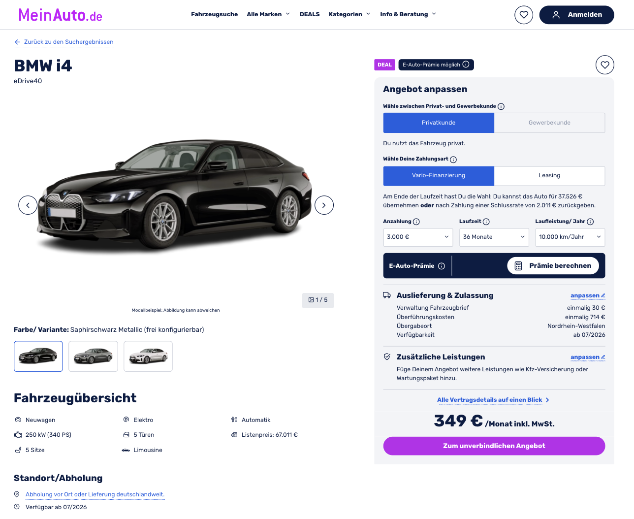Bayrisches Elektro-Gran-Coupé mit starkem Preisvorteil! Der BMW i4 eDrive40 bei MeinAuto für 349 Euro brutto im Monat zeigt im Vario-Leasing, wie attraktiv ein elektrisches Gran Coupé aktuell kalkuliert sein kann. Die Rate basiert auf 3.000 Euro Anzahlung, die der Basisförderung der Umweltprämie entspricht. Gleichzeitig bleibt das Konzept flexibel, denn am Ende der Laufzeit steht nicht automatisch der Rückgabezwang. Wer den i4 behalten möchte, kann ihn für 37.526 Euro übernehmen. Alternativ ist die Rückgabe nach Zahlung einer Schlussrate von 2.011 Euro möglich. Angeboten wird ein frei konfigurierbares Bestellfahrzeug, die Auslieferung ist für Juli 2026 vorgesehen.