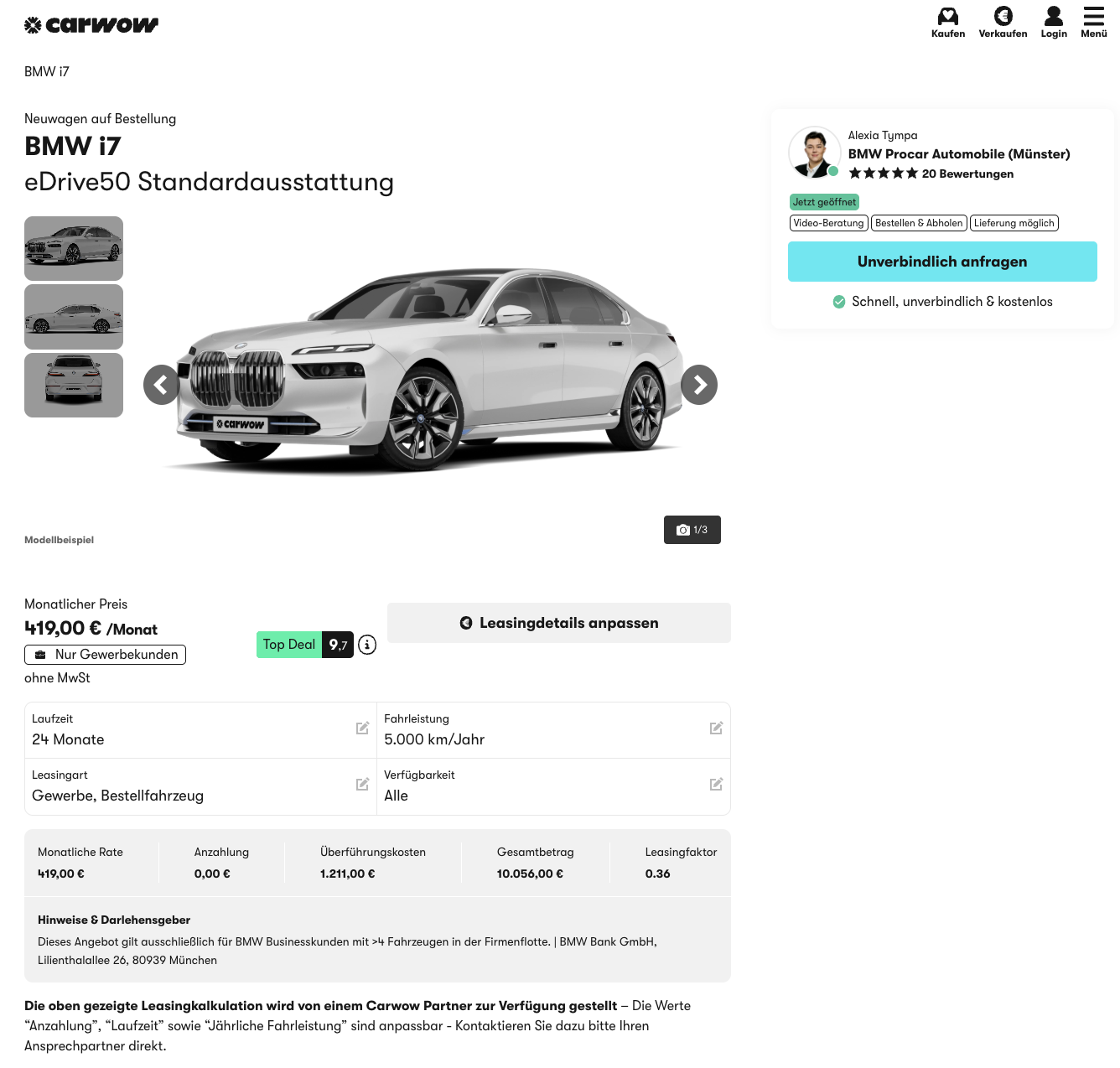 Der BMW i7 eDrive50 ist das elektrische Aushängeschild von BMW. Carwow bietet den BMW i7 eDrive50 im Geschäftsleasing für 419 Euro netto pro Monat an, eine ungewöhnlich scharf kalkulierte Hausnummer, zumal das Angebot exklusiv für BMW Businesskunden mit mehr als vier Fahrzeugen in der Firmenflotte gilt. Es handelt sich um ein frei konfigurierbares Bestellfahrzeug, ihr bestimmt, was in den i7 reinkommt. Mit einem Leasingfaktor 0,43 entsteht ein Paket, das Prestige und Budget erstaunlich gut zusammenbringt.