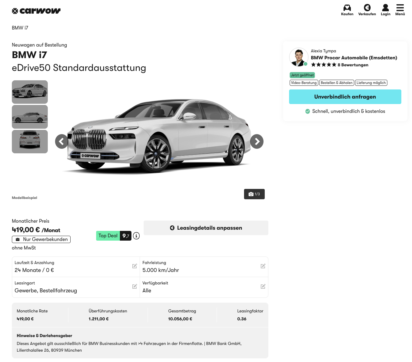 BMW i7 Leasing für 419 Euro im Monat netto [Flottenkunde]