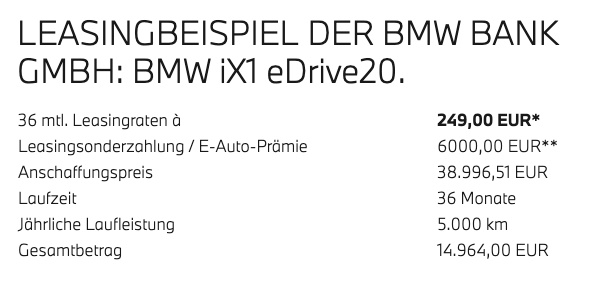 BMW iX1 Leasing für 249 [416] Euro im Monat brutto