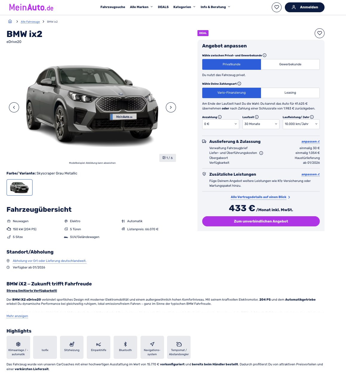 Coupé-SUV aus Bayern, mit üppiger Sonderausstattung auf Champions-League-Niveau. Den BMW iX2 eDrive20 gibt es aktuell bei MeinAuto für 433 Euro brutto im Monat im Vario-Leasing. Das Fahrzeug ist bereits bestellt und ab Januar 2026 in Skyscraper Grau Metallic, mit Sonderausstattung im Wert von 15.770 Euro erhältlich. Am Ende der Laufzeit bleibt ihr flexibel, entweder Übernahme für 41.625 Euro oder Rückgabe nach Zahlung einer Schlussrate von 1.983 Euro.