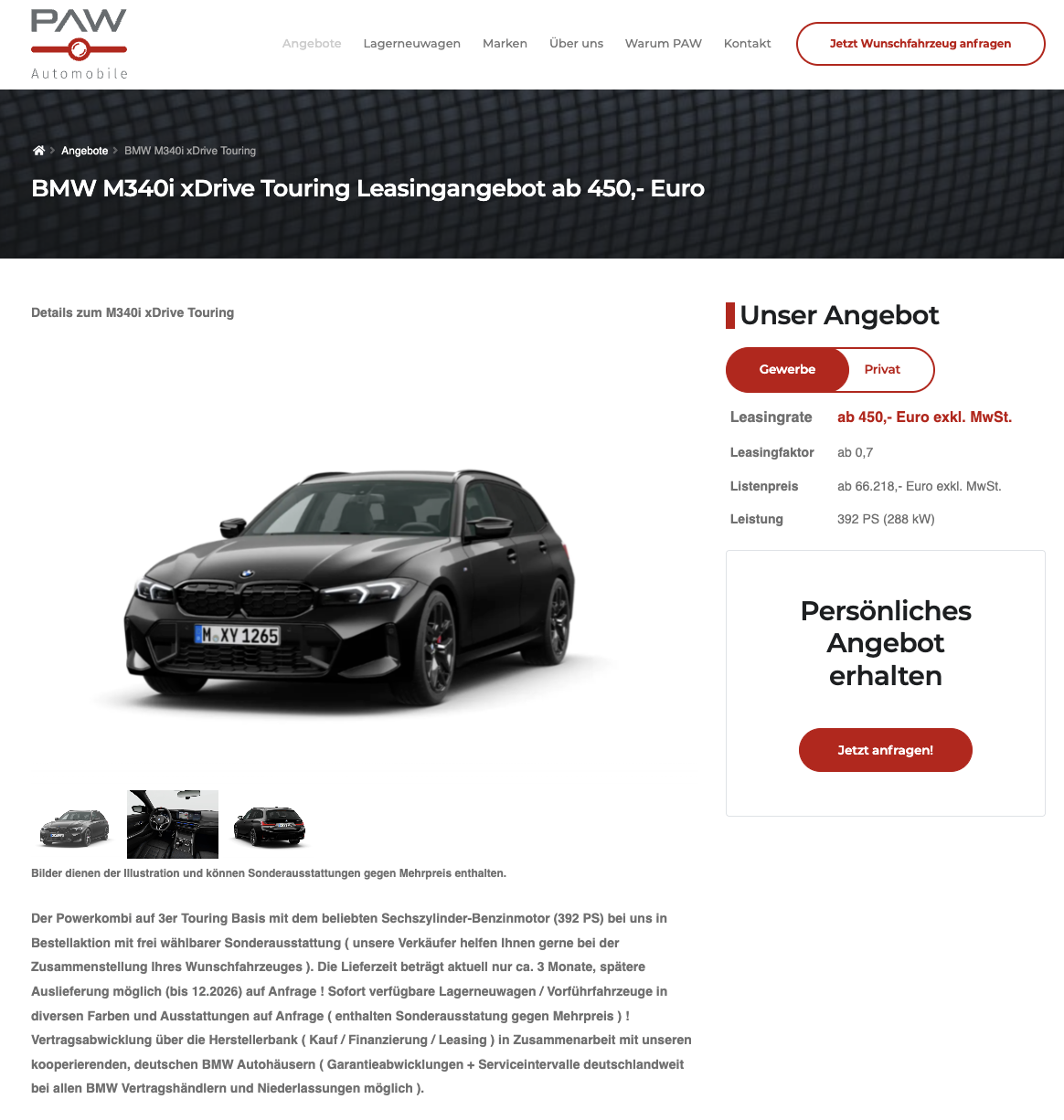 Der Dreier ist der Klassenschlager bei BMW und gilt seit Jahrzehnten als Maßstab seiner Klasse, sportlich, ausgewogen und vielseitig einsetzbar. Genau dieses Erfolgsrezept treibt der BMW M340i xDrive Touring bei PAW Automobile für 450 Euro netto im Monat auf die Spitze. Das Angebot richtet sich an Geschäftskunden und wurde mit einem Flottenrabatt von 30 Euro kalkuliert, der greift, sobald ein Fuhrpark aus mehr als vier Fahrzeugen besteht. Ohne diesen Nachlass liegt die Rate bei 480 Euro netto für Geschäftskunden, während Privatkunden mit 615 Euro brutto pro Monat rechnen. Wichtig dabei: Autohaus und Preis stehen von Beginn an fest, was die Einordnung im Markt erleichtert.