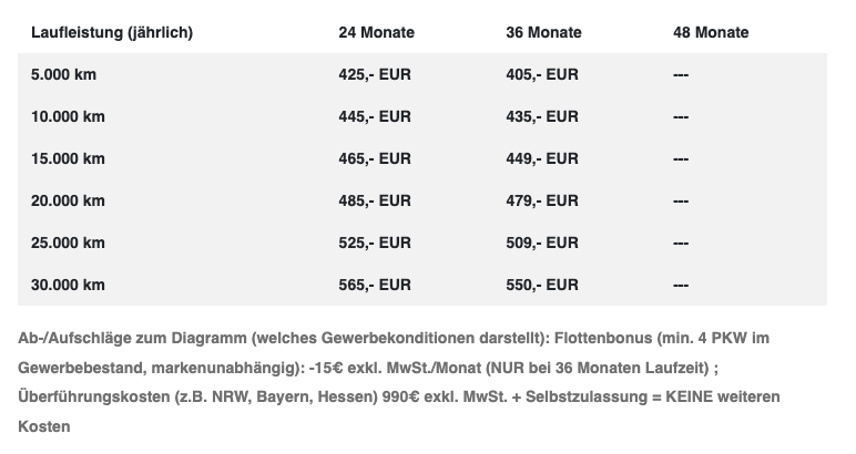 Die Kalkulation basiert auf 36 Monaten Laufzeit und 5.000 Kilometern jährlich, kann jedoch flexibel angepasst werden. Bei 10.000 Kilometern steigt die Rate auf 435 Euro netto im Monat.