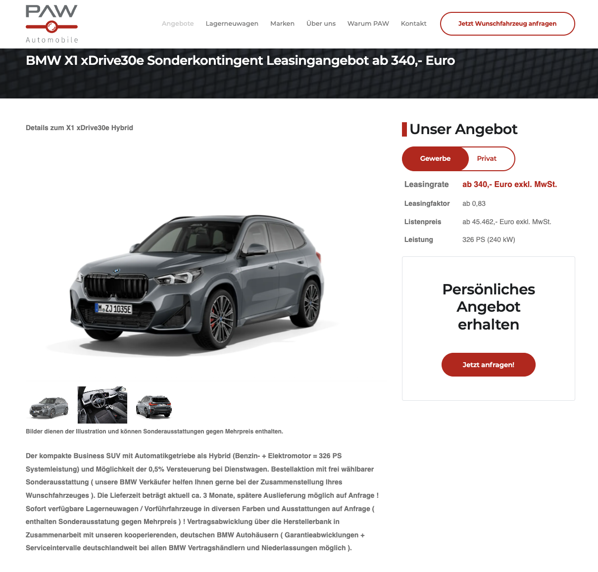Das Angebot von PAW Automobile fällt im direkten Vergleich klar auf. Während Wettbewerber für einen identisch motorisierten BMW X1 xDrive30e aktuell teils über 550 Euro netto pro Monat verlangen, liegt diese Konfiguration bei 340 Euro netto mit Flottenrabatt.