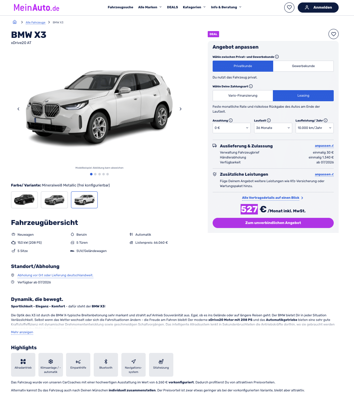 Klassische Linien, moderne verpackt, der neue BMW X3. Bei MeinAuto steht der xDrive20 AT als vorkonfiguriertes Bestellfahrzeug für 527 Euro brutto im Monat bereit. Das bayrische SUV kommt mit einer Sonderausstattung in Wert von 6.260 Euro. Dazu gehört das Innovationspaket und das Comfort Paket. Farblich könnt ihr zwischen Mineralweiß Metallic, Skyscraper Grau und Saphirschwarz Metallic wählen. Optional könnt ihr das Fahrzeug aber auch ganz nach euren Wünschen frei konfigurieren. Die Auslieferung dauert etwas länger und ist für Juli 2026 angesetzt.