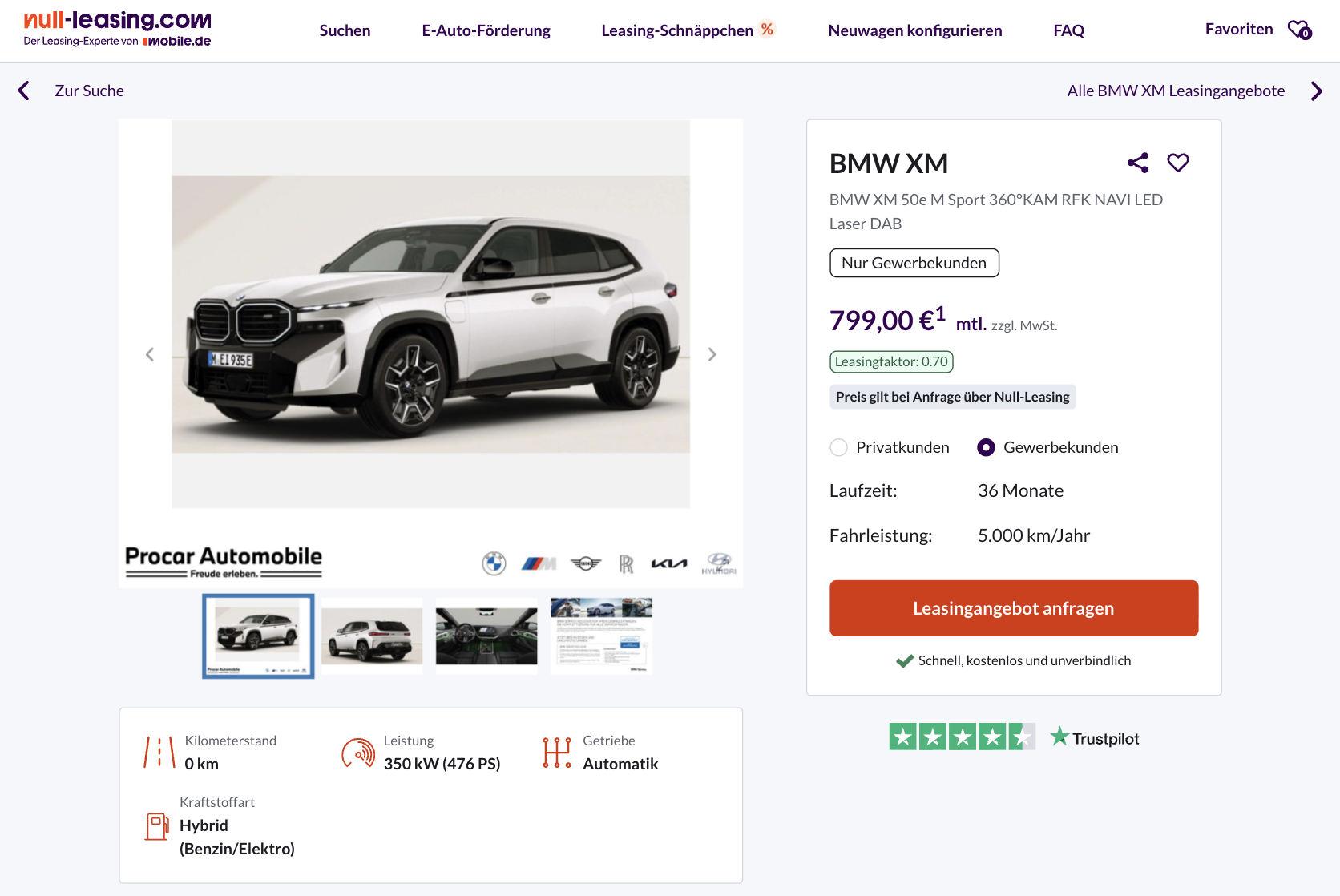 Gerade im Vergleich wird das Angebot spannend. Während ein ähnlich ausgestatteter BMW XM 50e beim Marktführer rund 1.499 Euro netto pro Monat kostet, liegt dieses Angebot mit 799 Euro netto klar darunter.