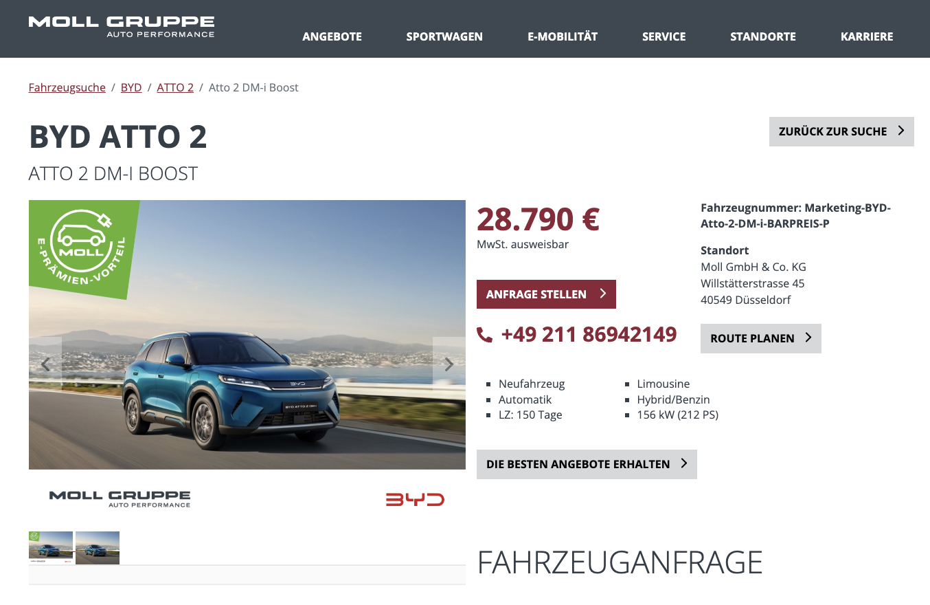 Modern, effizient und im Alltag vielseitig einsetzbar, der BYD ATTO 2. Beim Autohaus Moll gibt es jetzt den BYD ATTO 2 DM-i Boost als attraktiven Kaufdeal für 28.790 Euro brutto und bringt ein interessantes Plug-in-Hybrid-Konzept in das Kompakt-SUV-Segment. Angeboten wird ein Bestellfahrzeug mit einer Lieferzeit von rund fünf Monaten. Wichtig für die Einordnung, der Fahrzeugpreis versteht sich zuzüglich 1.300 Euro Überführungskosten, dafür wird die Zulassung kostenlos übernommen. Genau diese Transparenz macht das Angebot greifbarer und sorgt für eine realistische Kalkulation.