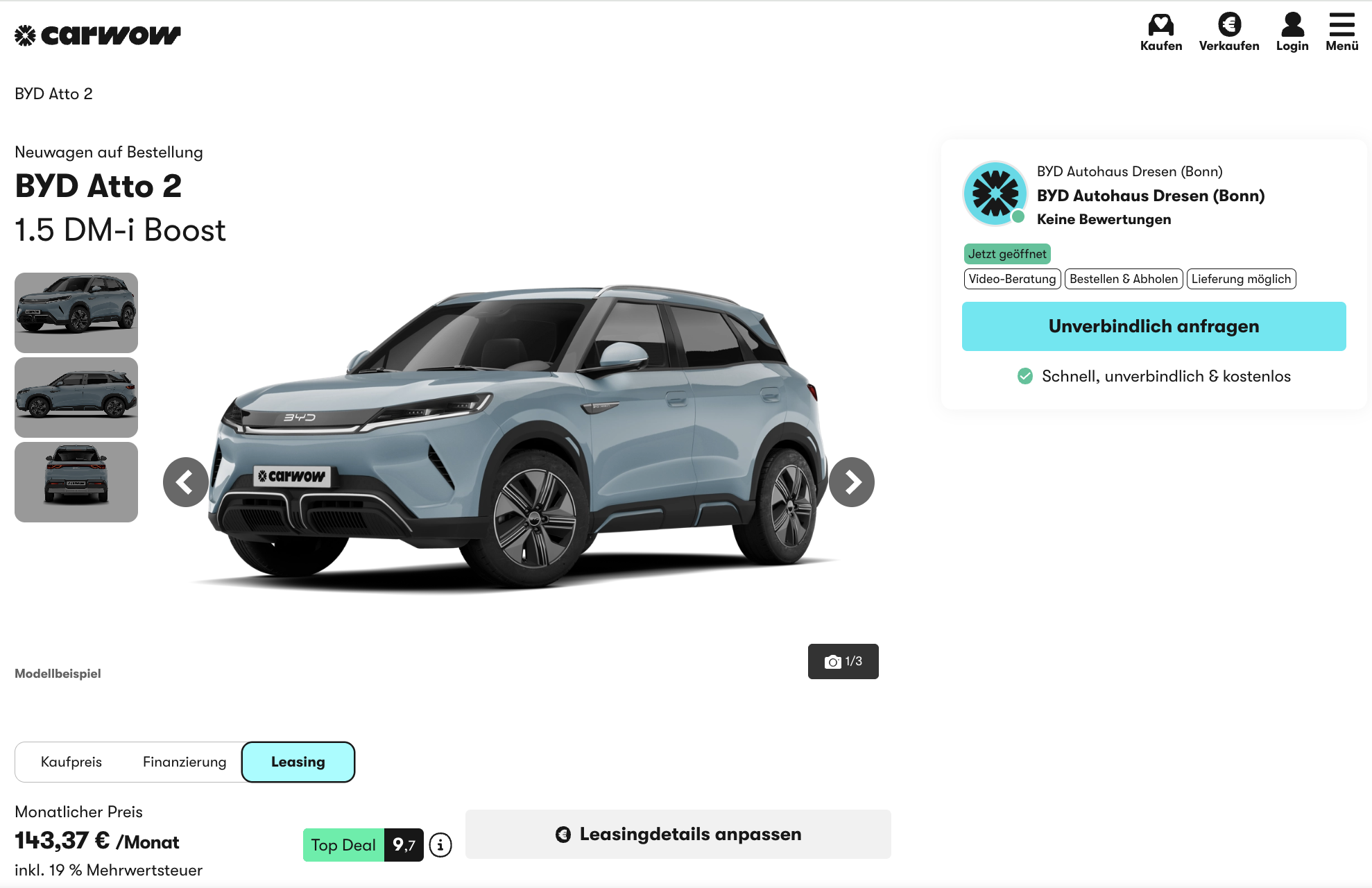 BYD zum Kampfpreis! Privatkunden können den BYD ATTO 2 1.5 DM-i Boost, ein kompaktes SUV mit moderner Hybridtechnik, bei carwow für 143,37 Euro brutto pro Monat leasen. Das attraktive Angebot beinhaltet eine Sonderzahlung von 4.000 Euro in Form der Umweltprämie, die den Einstieg deutlich erleichtert.
