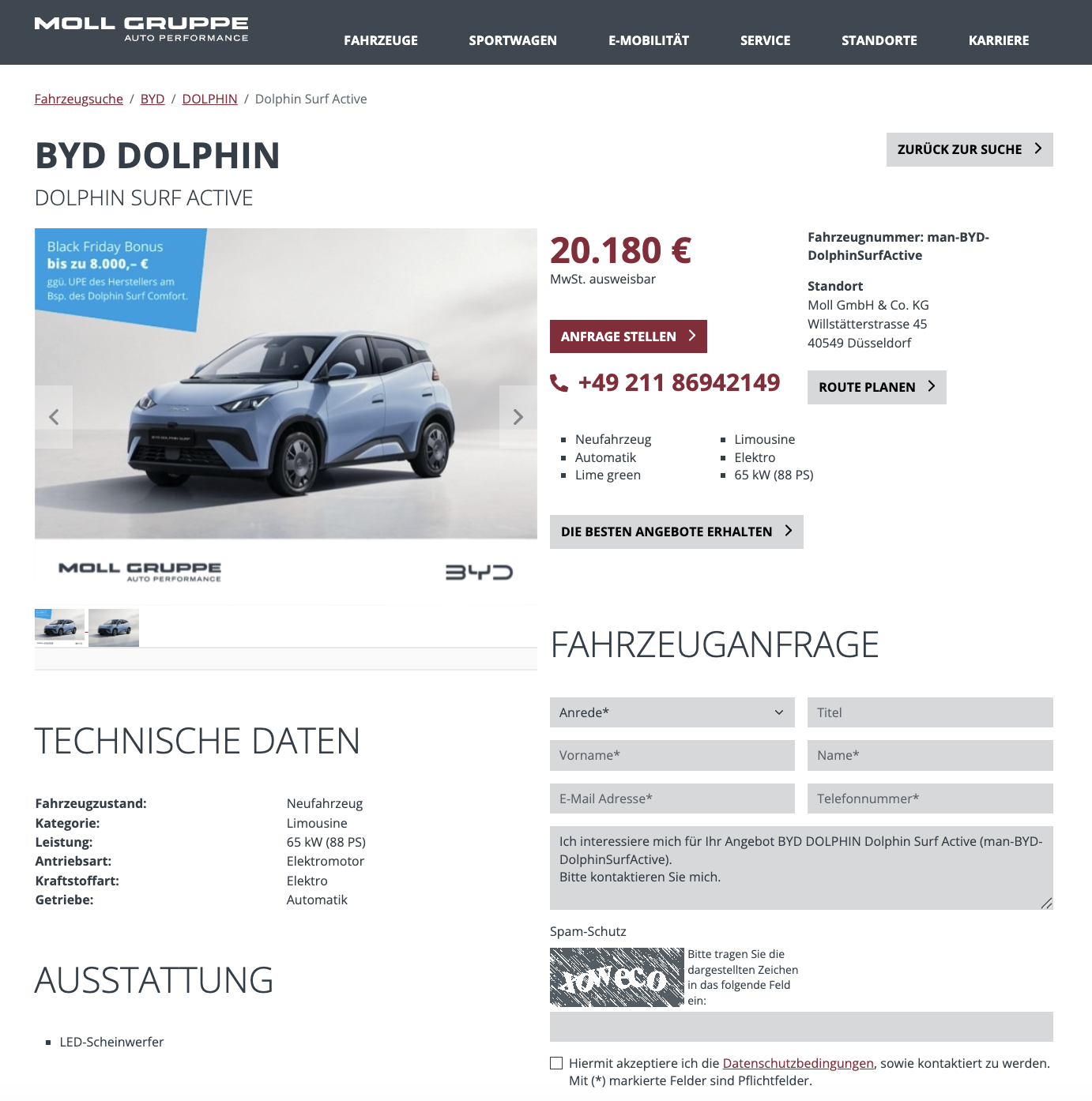 Beim aktuellen Black-Friday-Special vom Autohaus Moll bekommt ihr einen kompakten Stromer zum Schnäppchenpreis. BYD Dolphin Surf 115 kW Active für 20.180 Euro brutto inklusive Überführungskosten, als frei konfigurierbares Bestellfahrzeug und damit ohne Vorgaben bei Farbe, Felgen oder Innenraum. Im Vergleich zur UVP von 20.180 Euro steckt ein Preisvorteil von 4.000 Euro drin, also rund 17 Prozent Rabatt auf einen vollwertigen, modern ausgestatteten Elektro-Kleinwagen. Das Angebot läuft als Black-Deal bis zum 30.11.2025 oder solange Fahrzeuge verfügbar sind, wer die eigene E-Mobilität gern mit einem festen Kaufpreis starten möchte, sollte sich diesen Zeitraum merken.