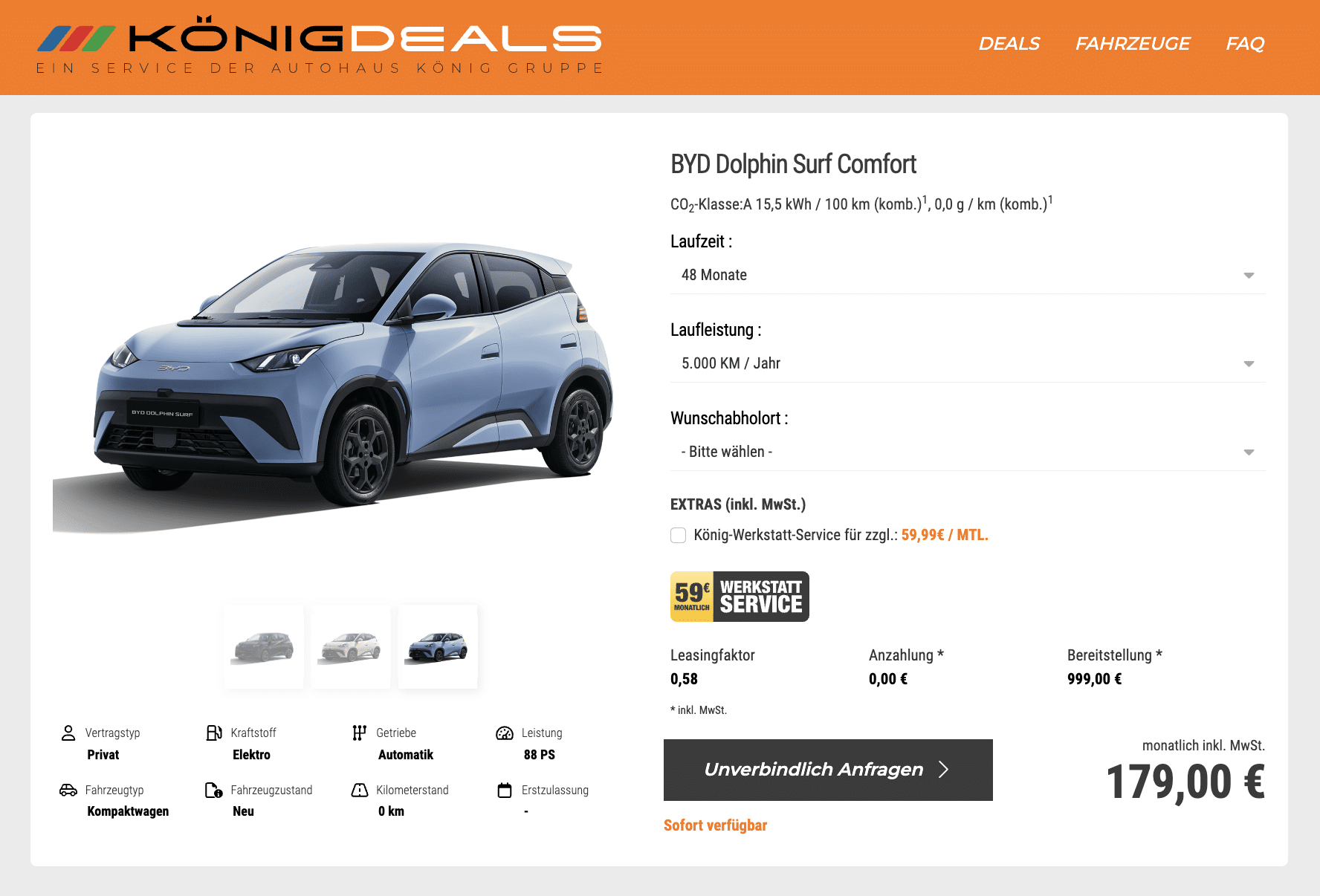 Bei KÖNIGDEALS wartet ein spannendes Angebot auf alle, die Elektromobilität frisch erleben wollen: Der BYD Dolphin Surf Comfort ist als sofort verfügbarer Lagerwagen in mehreren Farben ab 189 Euro brutto im Monat zu haben. Ein kompakter Elektroflitzer, der in der Stadt glänzt und zugleich genug Reichweite für entspannte Ausfahrten bietet.