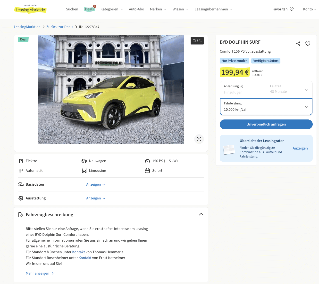 Das Privatleasing ist mit 48 Monaten und 10.000 km/Jahr kalkuliert, wobei die Laufleistung anpassbar ist. Unterm Strich bekommst du mit dem BYD Dolphin Surf Comfort ein sehr rundes E-Paket, mit knackigem Design, üppige Ausstattung, solide Reichweite und flotte Ladezeiten.