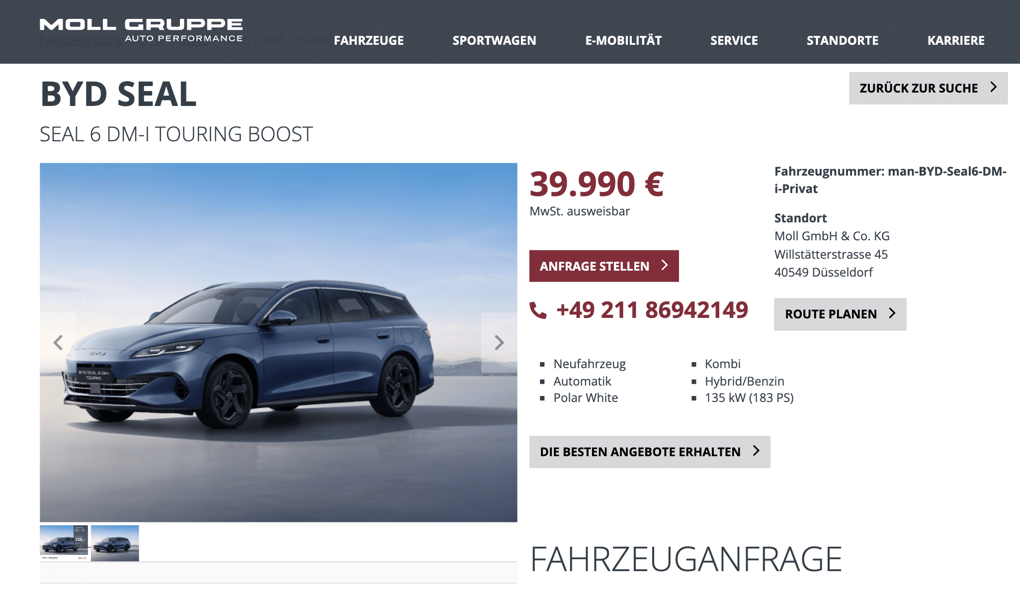 Wer Platz, Technik und niedrige Betriebskosten vereinen will, hat mit dem SEAL 6 DM-i Touring Boost einen starken Kandidaten. Das Angebot von Autohaus Moll liegt bei 329 Euro brutto im Monat, ein familien- und businesstauglicher Plug-in-Hybrid-Kombi mit smartem Technikpaket und ehrlichem Nutzwert.