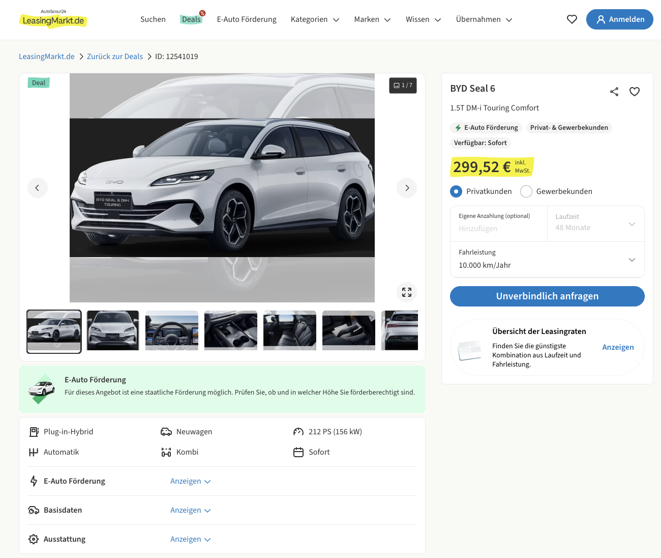 Das Leasingangebot ist auf 48 Monate Laufzeit und 10.000 Kilometer pro Jahr ausgelegt. In Kombination mit der fehlenden Sonderzahlung entsteht ein Paket, das finanziell gut kalkulierbar bleibt. Gerade für alle, die flexibel zwischen elektrischem Fahren und klassischem Antrieb wechseln möchten, bietet der BYD Seal 6 DM-i Touring Comfort eine interessante Alternative im aktuellen Markt.