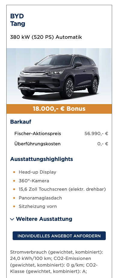 Vollelektrisches SUV, sieben vollwertige Sitzplätze und ein Preis, der deutlich unter Liste liegt, genau darum geht es hier. Der BYD Tang 380 kW steht bei Fischer Automobile für 56.990 Euro brutto inklusive Überführungskosten bereit, als frei konfigurierbares Bestellfahrzeug. Im Vergleich zur UVP von 74.990 Euro liegt ein Preisvorteil von 18.000 Euro dazwischen, das entspricht rund 24 Prozent Rabatt auf ein Elektro-SUV mit drei Sitzreihen und üppiger Serienausstattung. Die Aktion läuft bis zum 30.11.2025 oder solange Kontingent vorhanden ist, wer den Kurs mitnehmen möchte, sollte den Entschluss also nicht zu lange nach hinten schieben.