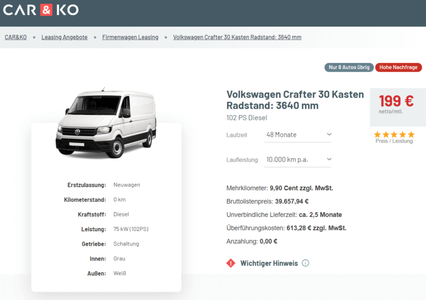 8. August 2019 Volkswagen Crafter 30 2.0 TDI Kasten Radstand: 3.640 mm Leasing für 199 Euro im Monat netto Hier habe ich mal einen etwas anderen Deal bei CAR&KO für euch. Dieses Angebot spricht wohl eher Handwerker bzw. Gewerbekunden, die viel Platz für Werkzeug... Verbrauch: kombiniert: 7,6 l/100 km* • Emissionen: kombiniert: 201 g/km CO2* Hitze200°
