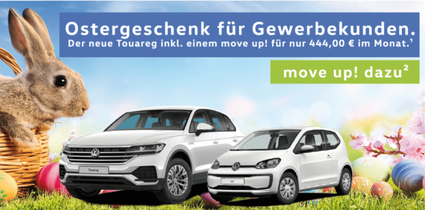 14. März 2019 Osteraktion! VW Touareg 3.0 V6 TDI inkl. VW up! Leasing für 444 Euro im Monat netto Aktuell können sich Geschäftskunden bei Plätz diese 2 in 1 Osteraktion sichern. Für eine Leasingrate gibt es gleich zwei Fahrzeuge. Einen geräumigen VW Touareg und... VW Touareg Verbrauch: innerorts: 7,7 l/100 km • außerorts: 5,9 l/100 km • kombiniert: 6,6 l/100 km* • Emissionen: kombiniert: 173 g/km CO2*